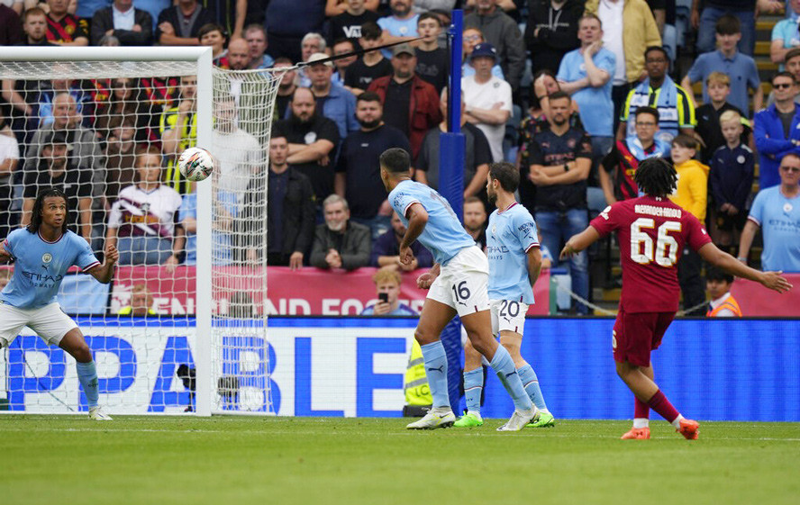 Phil Foden tung cú đá chận chân rất nhanh nhưng Adrian đổ người đẩy ra. Haaland lao vào đá bồi cận thành dội xà, bỏ lỡ cơ hội cực kỳ đáng tiếc.