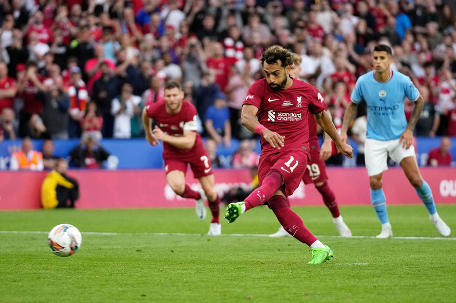 Salah tạt vào từ cánh phải cho Darwin Nunez đánh đầu bật tay trung vệ Ruben Dias. Sau khi tham khảo VAR, trọng tài Pawson liền cho Liverpool được hưởng phạt đền.