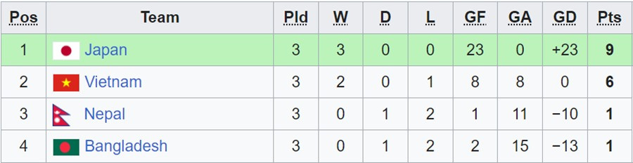Do có 3 bảng 3 đội nên thành tích của đội nhì với đội cuối bảng không được tính. Khi đó chiến thắng 6-1 của nữ Việt Nam trước các cô gái Bangladesh sẽ mang đến nhiều lợi thế, dù có để thua Nhật Bản.
