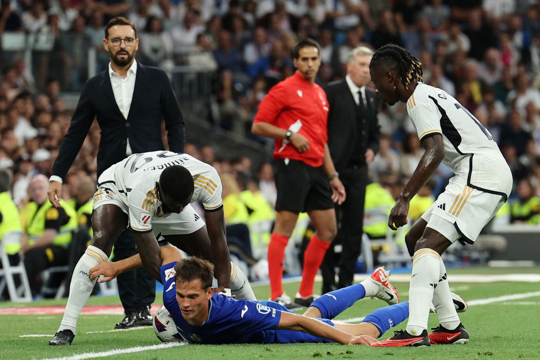 Trận đấu sớm đi theo hướng trái ngược với sự chờ đợi của các Madridista. Sai lầm của cầu thủ trẻ Fran Garcia khiến người cũ Borja Mayoral trừng phạt đội chủ nhà ghi bàn mở tỷ số ngay phút 11.