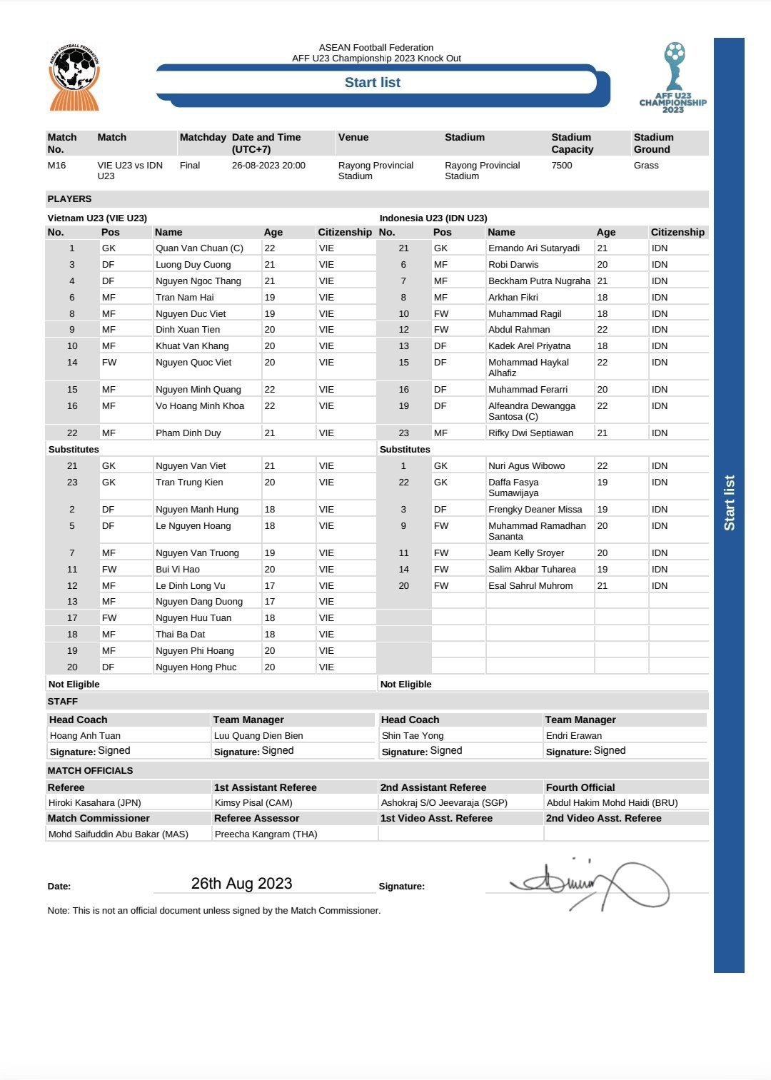 U23 Indonesia: Ernando; Robi Darwis, Beckham Putra, Arkhan Fikri, Muhammad Ragil, Abdul Rahman, Kadek Arel, Haykal Alhafiz, Muhammad Ferarri, Alfeandra Dewangga, Rifky Dwi Septiawan.