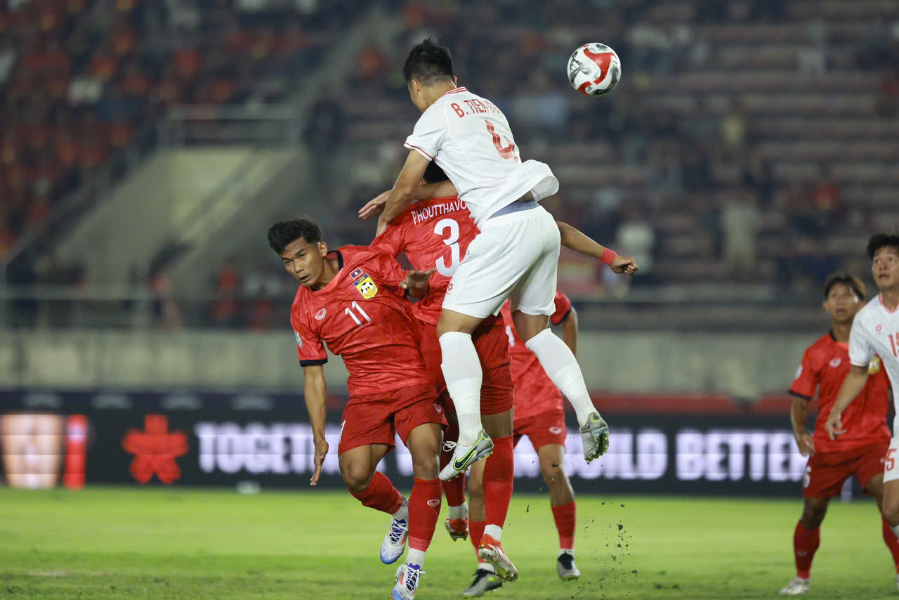 Đội trưởng Duy Mạnh phất đường chuyền vượt tuyến đưa bóng vào vòng cấm Lào để Vĩ Hào thoát xuống đánh đầu hiểm hóc nhưng thủ môn Xaysavath cản phá xuất sắc.