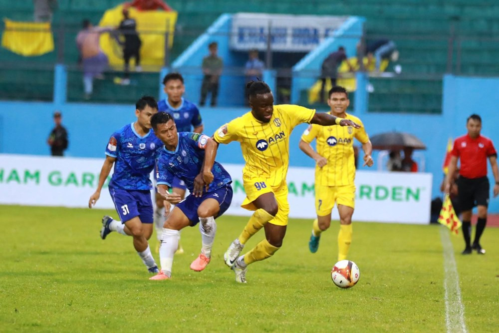 Sân 19/8 Nha Trang: Đội bóng xứ Nghệ đang tổ chức ép sân để tìm kiếm cơ hội ghi bàn định đoạt trận đấu.