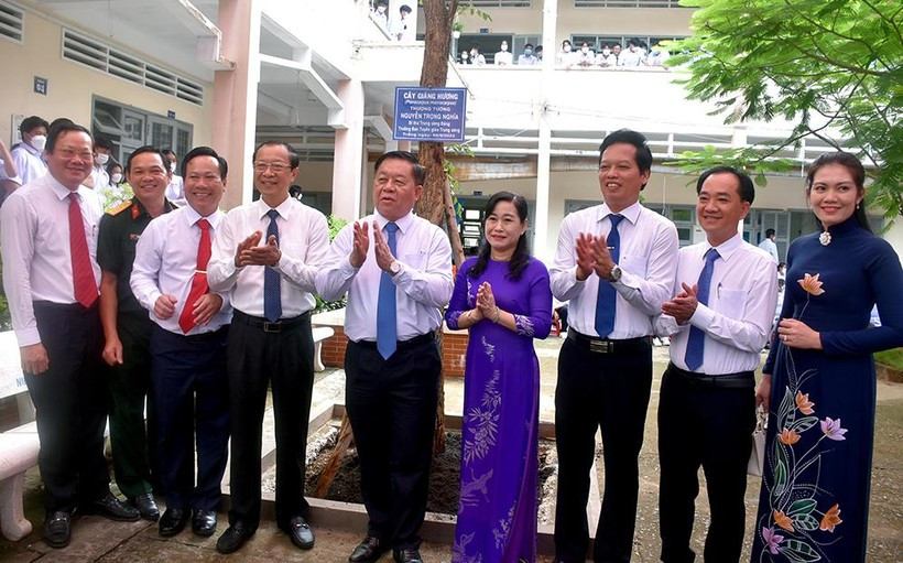 Bí thư Trung ương Đảng, Trưởng ban Tuyên giáo Trung ương Nguyễn Trọng Nghĩa và Thứ trưởng Bộ GD-ĐT Phạm Ngọc Thưởng cùng các đại biểu trồng cây lưu niệm tại Trường THPT Trương Định. |