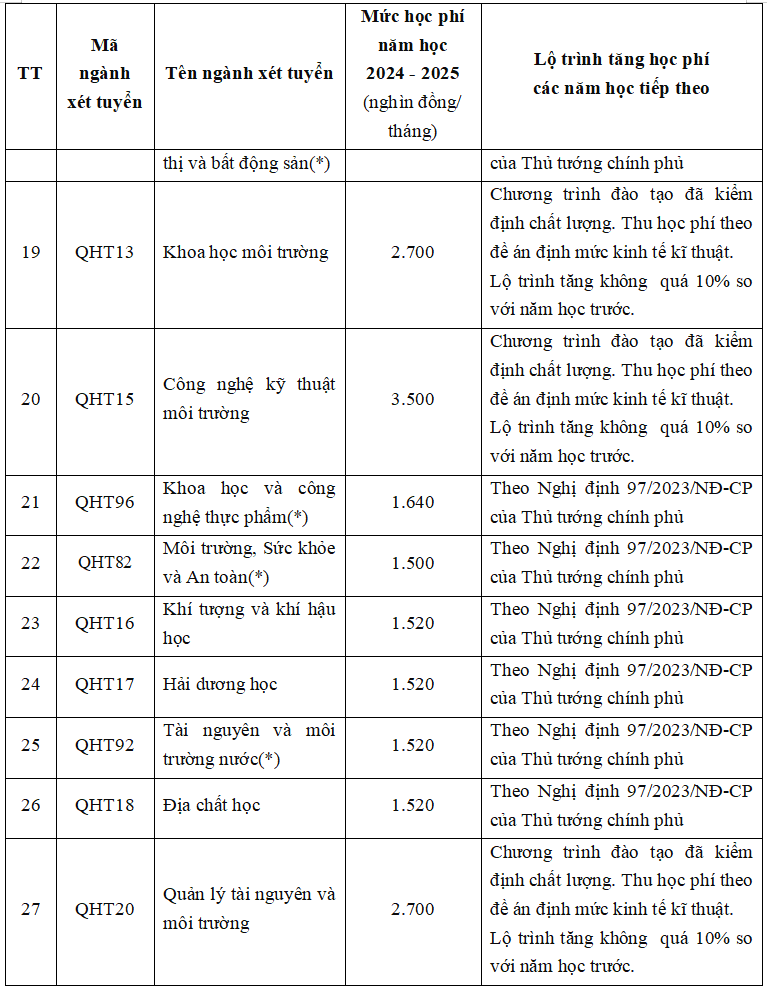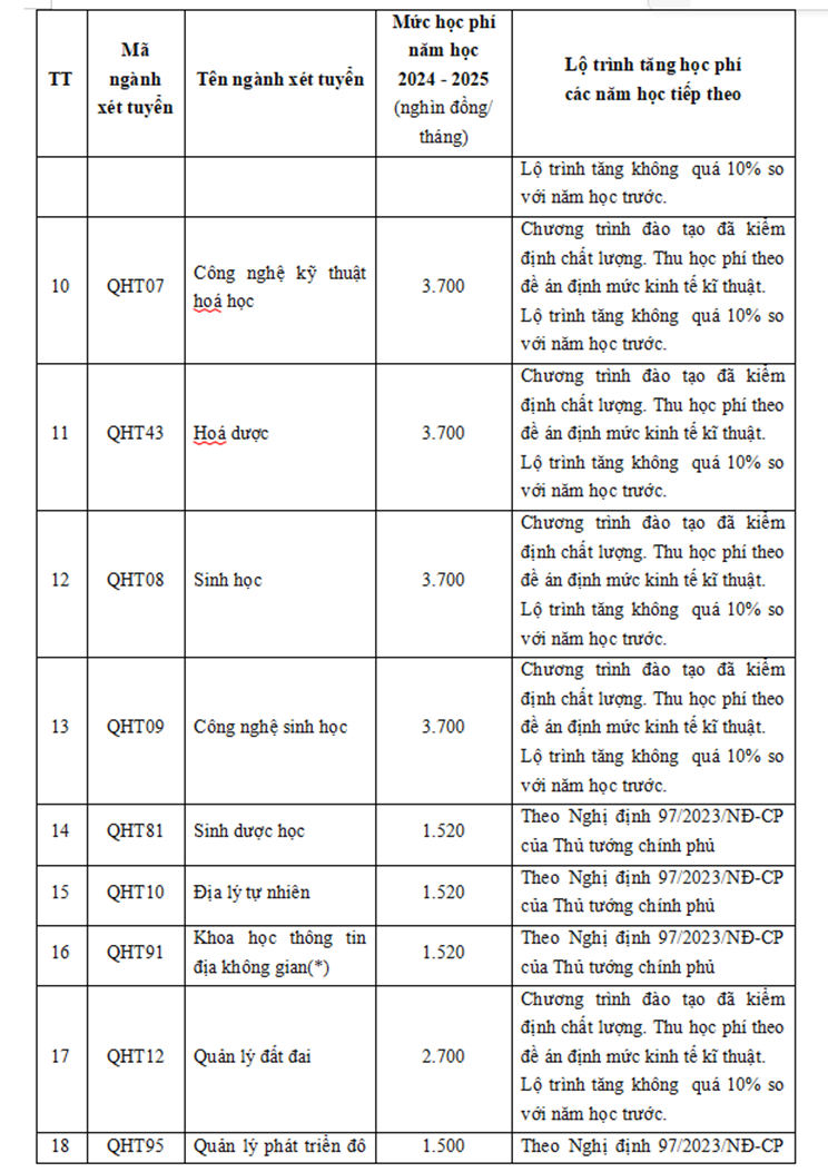 Dự kiến mức học phí năm học 2024-2025 và lộ trình tăng học phí các năm học tiếp theo của Trường ĐH Khoa học Tự nhiên như sau: