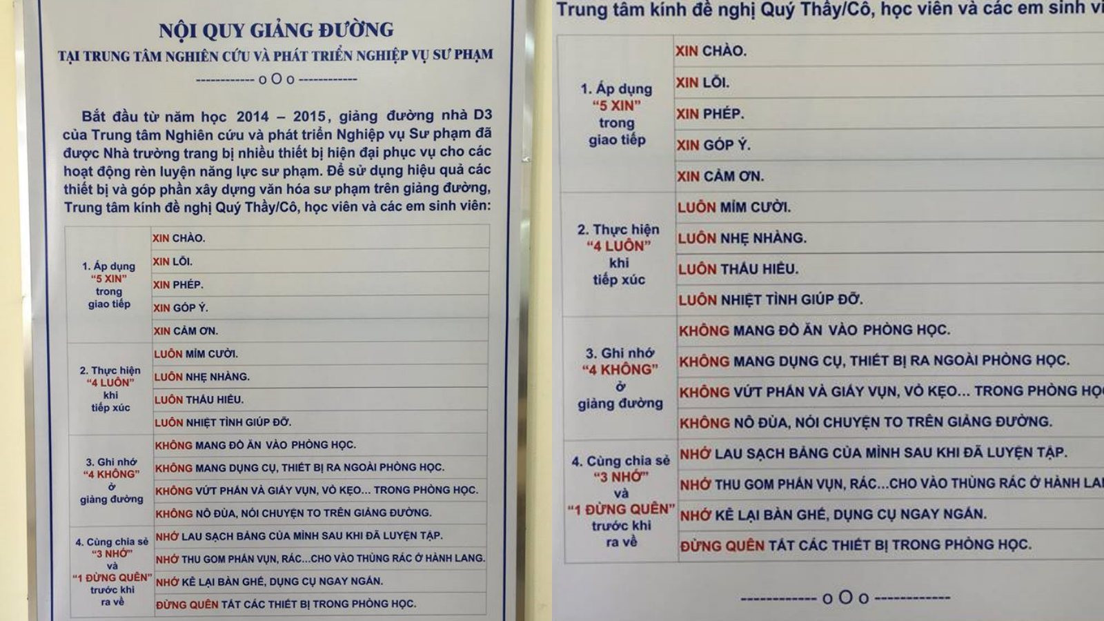 Để xây dựng văn hóa sư phạm trên giảng đường, Trung tâm nghiên cứu và phát triển nghiệp vụ sư phạm của Trường ĐH Sư phạm Hà Nội đã đưa ra bảng nội quy “5 xin, 4 luôn, 4 không, 3 nhớ” với sinh viên và giảng viên.