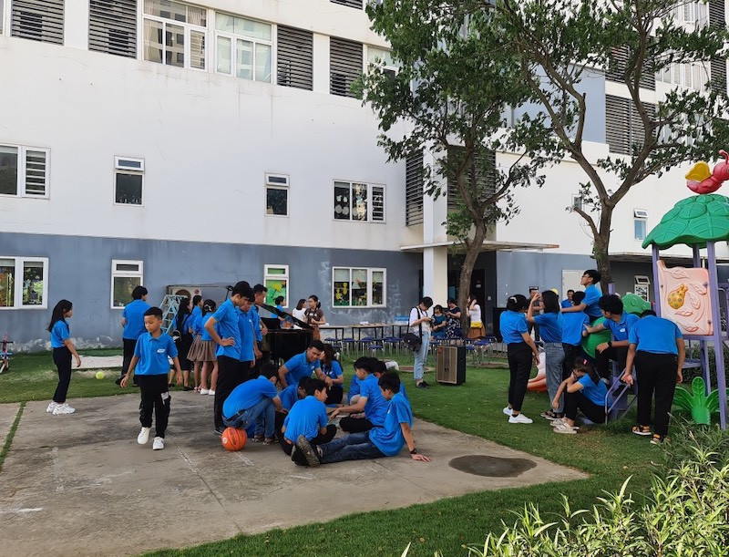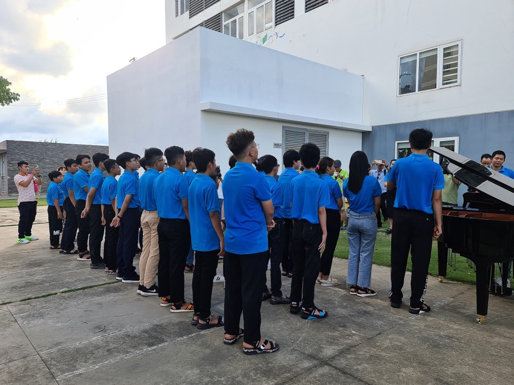 Chúng tôi được gặp các em ngay dưới khu vực ăn ở, sinh hoạt - là một toà nhà cao tầng nằm trong FPT City rất rộng ở Đà Nẵng. Sau những bỡ ngỡ ban đầu, hàng chục bé tuổi đời từ lớp 1 đến lớp 12 bắt đầu cùng ca hát, cùng chơi thể thao với những cô chú, anh chị trong đoàn. Những khó khăn, mất mát dường như không còn hiện diện trong đôi mắt các em.