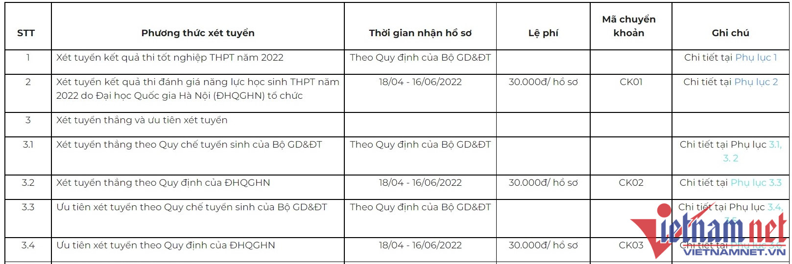 Các phương thức tuyển sinh của trường năm 2022 như sau: