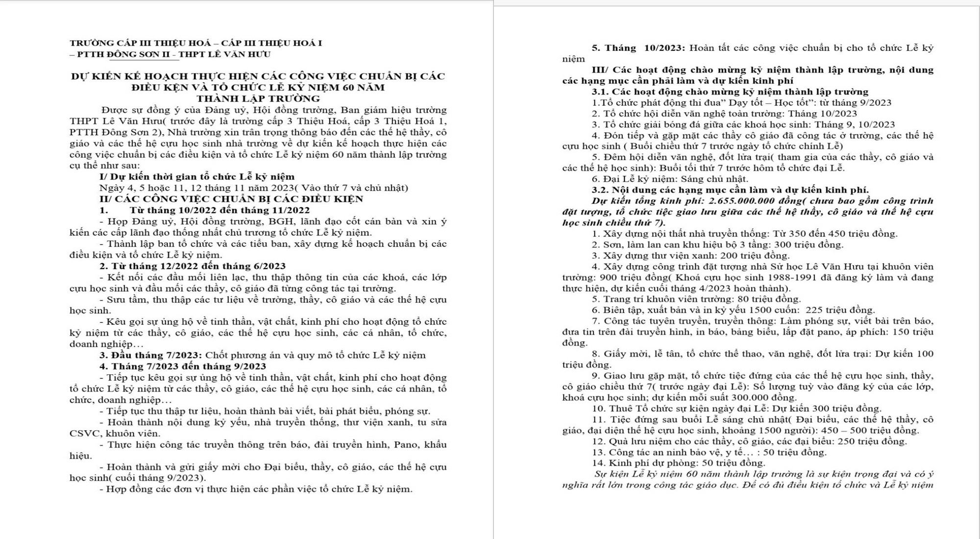 Trao đổi với VietNamNet, ông Lê Đình Sinh, Hiệu trưởng Trường THPT Lê Văn Hưu thừa nhận, nhà trường có kế hoạch và kêu gọi tổ chức lễ kỷ niệm 60 năm ngày thành lập trường, với tổng kinh phí dự kiến hơn 2,6 tỷ đồng.