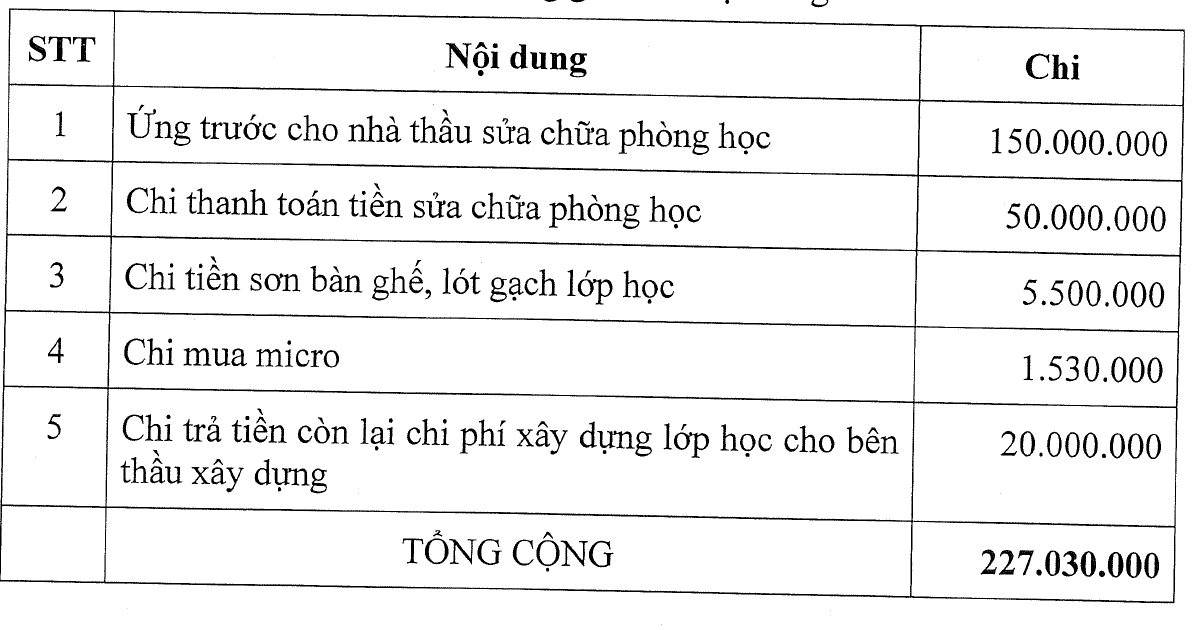 Số tiền trả lại cho phụ huynh là các khoản đã chi cho công trình cải tạo lớp học do Ban đại diện cha mẹ học sinh đã quyết với gần 228 triệu đồng gồm các hạng mục như ứng trước cho nhà thầu sửa chữa phòng học 150 triệu, chi thanh toán sửa chữa phòng học 50 triệu, sơn bàn ghế -lát gạch lớp 5,5 triệu, mua micro 1,5 triệu, trả tiền còn lại cho nhà thầu 20 triệu.