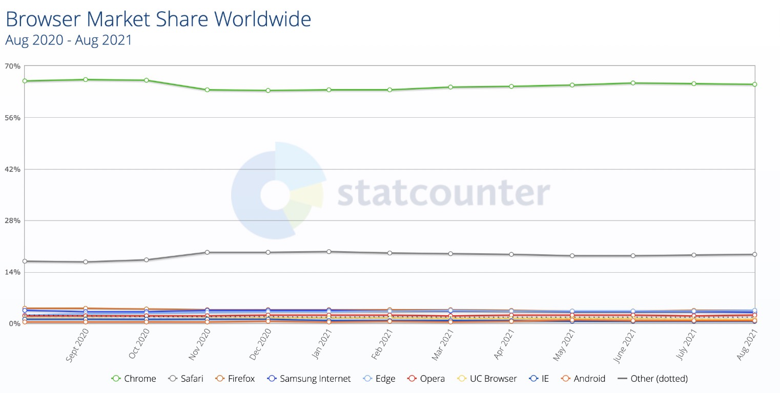 Gần cuối mùa hè năm 2012, Google được công bố đã dẫn đầu thị phần trình duyệt, với 31% người dùng chọn Chrome. Microsoft chắc chắn đã giúp đẩy nhanh sự sụp đổ của chính họ bằng cách không thực sự đổi mới với các tính năng của Internet Explorer, trong thời điểm mà Chrome đã hướng đến tương lai của các ứng dụng web. Theo Statcounter, đến tháng 8/2021, Chrome chiếm 65% thị phần trình duyệt.