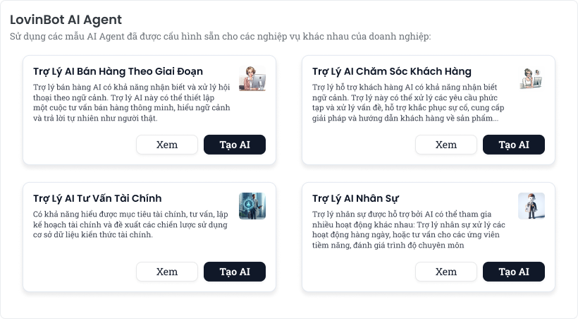 AI Agent là công nghệ mới nhất về “AI tạo sinh” trên thế giới được tích hợp vào chatbot. Công nghệ này trở nên thông minh hơn rất nhiều vì có thể suy nghĩ, hiểu ngữ cảnh và phản hồi người dùng tốt hơn bằng ngôn ngữ tự nhiên. AI Agent dễ dàng huấn luyện từ các data có sẵn của doanh nghiệp, từ đó có thể thực hiện các nhiệm vụ phức tạp như tư vấn bán hàng theo giai đoạn, trở thành một trợ lý nhân sự tư vấn chính sách cho bộ phận nhân sự, hay có thể được huấn luyện để trả lời các dữ liệu tài chính kết nối thời gian thực gắn lên website, messenger hay bất kỳ nền tảng nào doanh nghiệp cần với chi phí phù hợp.