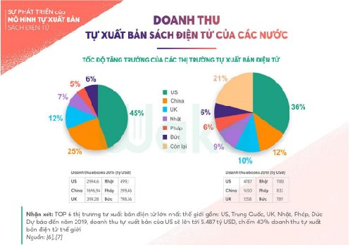 Theo Báo cáo thị trường sách điện tử - Quý IV/2018 và Quý I/2019 của Nền tảng Xuất bản điện tử Waka, sau một thời gian dài triển khai mô hình tự xuất bản điện tử, các thị trường châu Âu và châu Mỹ bước vào giai đoạn tăng trưởng ổn định. Top 6 thị trường tự xuất bản điện tử lớn nhất thế giới gồm Mỹ, Trung Quốc, Anh, Nhật, Pháp, Đức, trong đó thị trường Mỹ nhiều năm giữ vị trí cao nhất về doanh thu sách điện tử. Năm 2018, doanh thu ebook ở Mỹ đạt 4.787 tỷ USD, chiếm 36% doanh thu ebook trên toàn thế giới. Dự báo trong năm 2019, doanh thu tự xuất bản của Mỹ sẽ lên tới 5.487 tỷ USD.