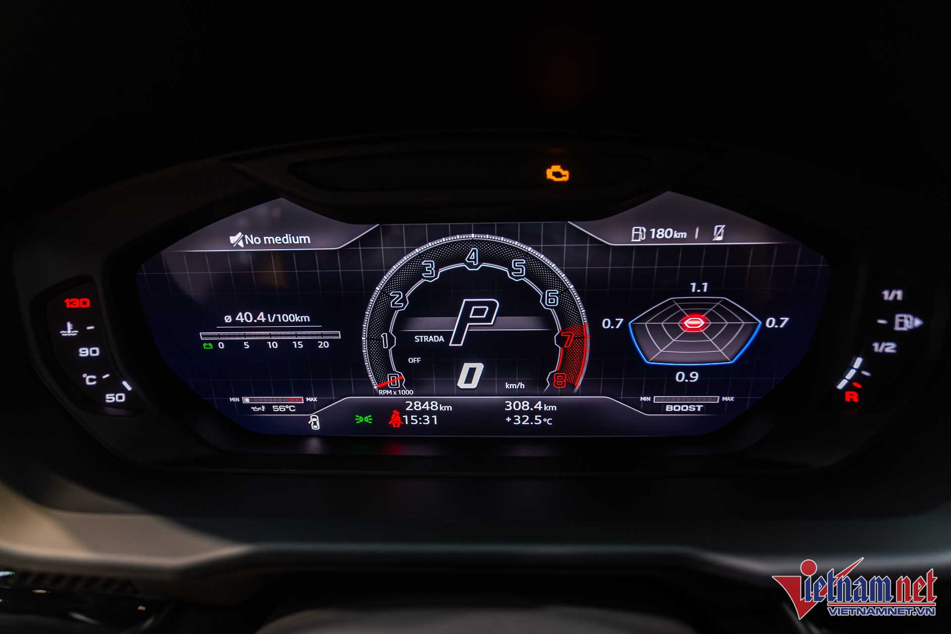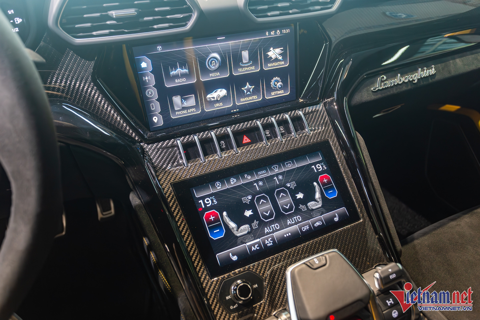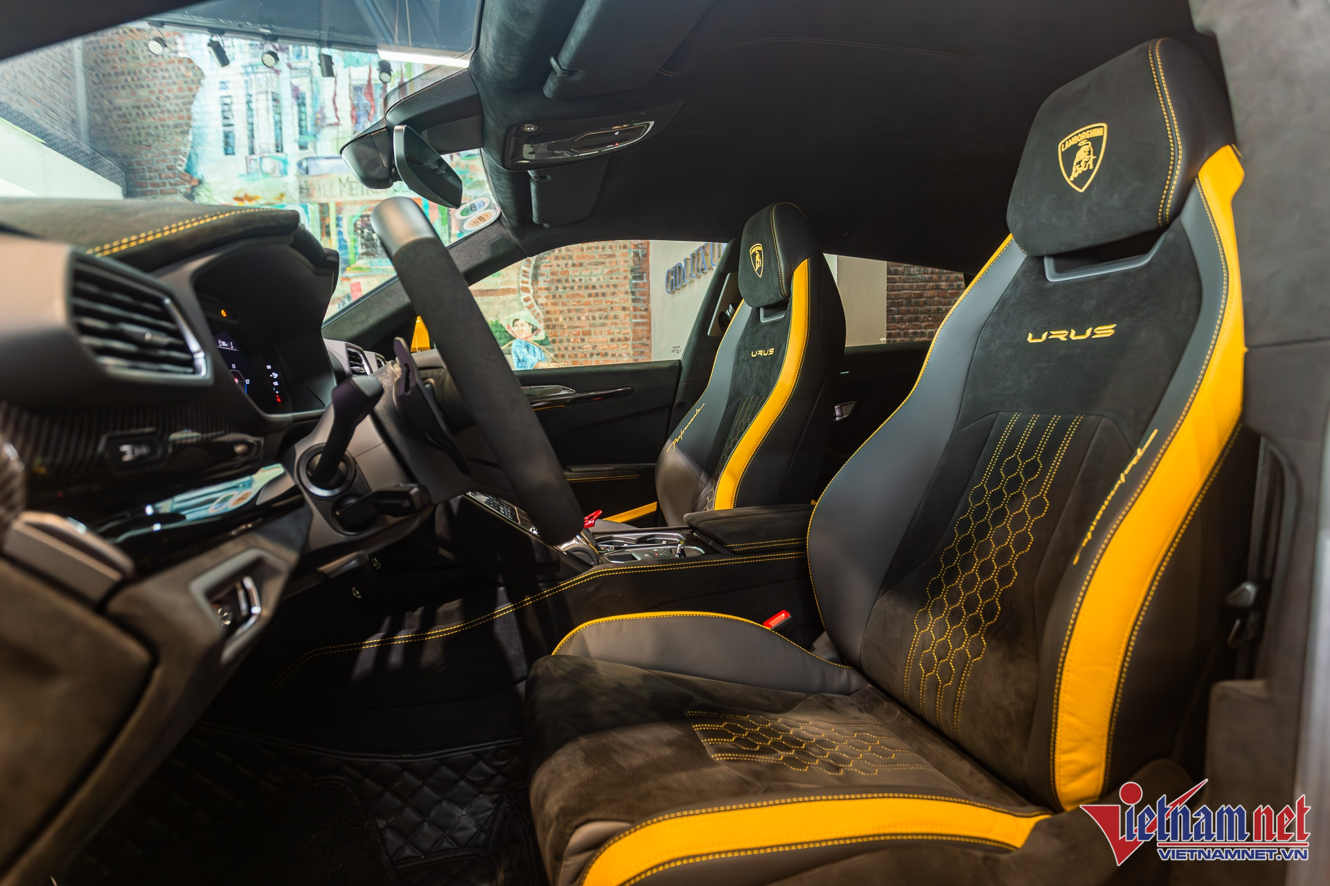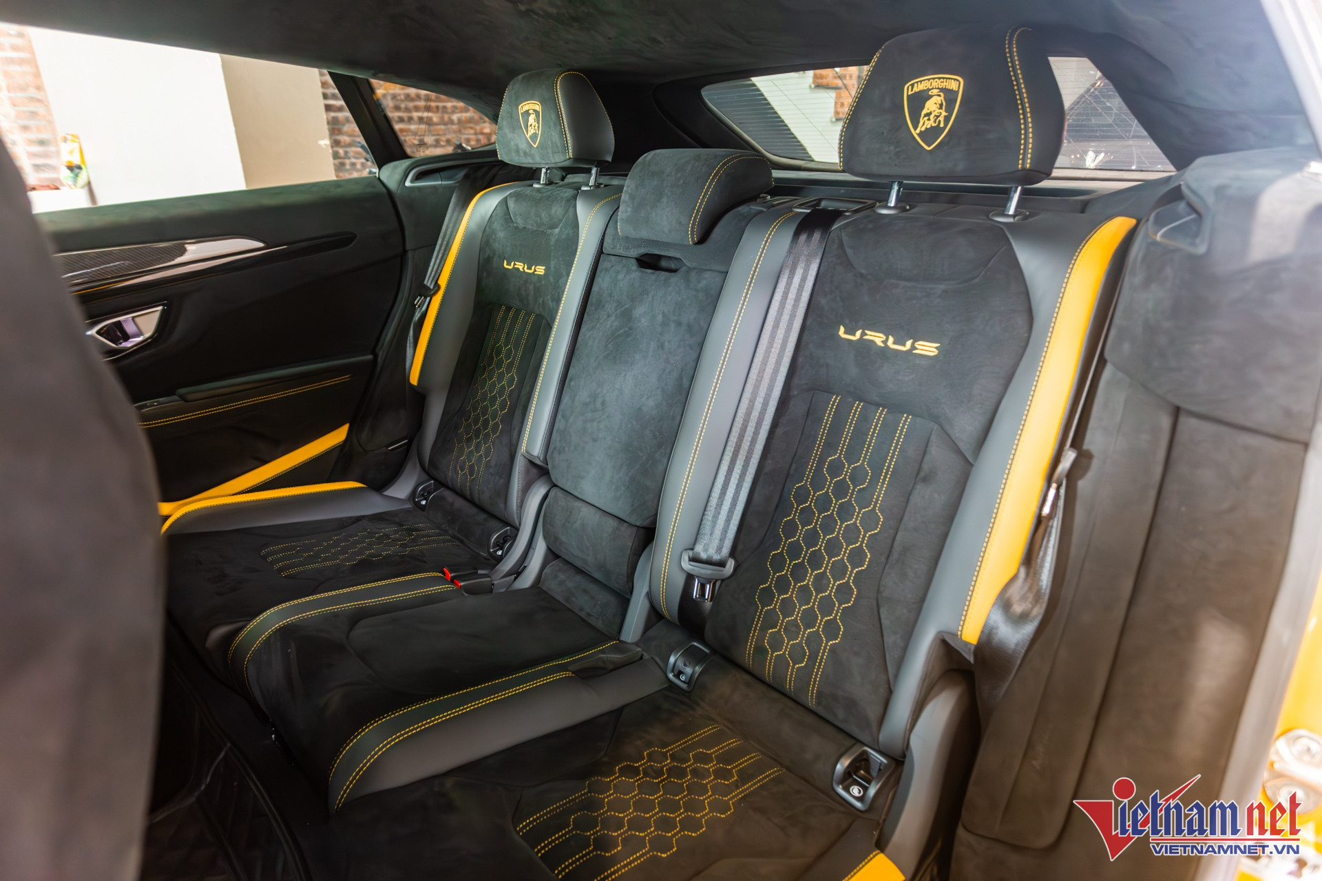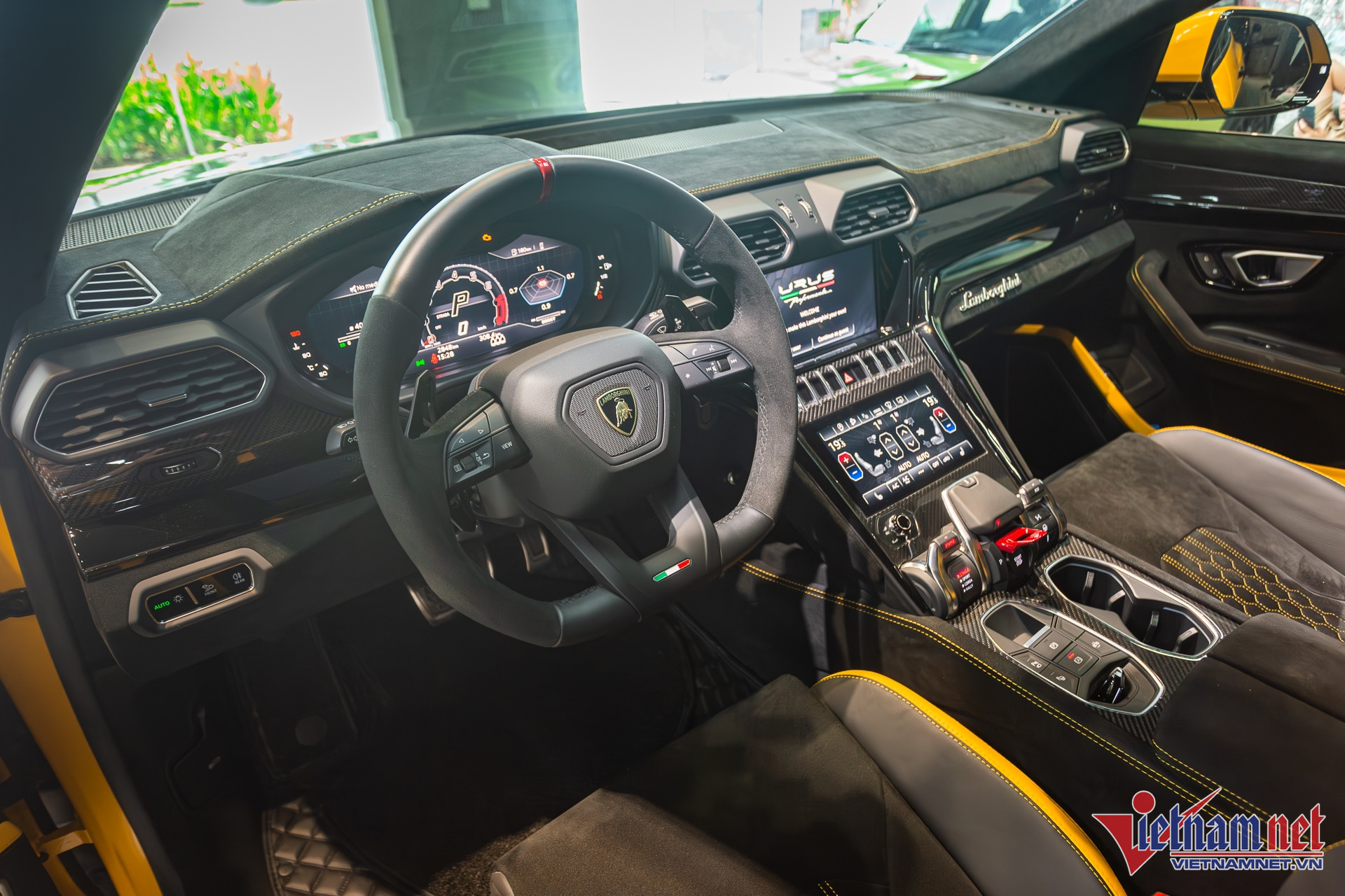 Nội thất chiếc Urus Performante này dùng tông màu đen chủ đạo, kết hợp cùng màu vàng ở đường viền và đường chỉ khâu. Ghế ngồi thể thao bọc da cao cấp và vật liệu Alcantara. Hàng ghế sau gồm 3 chỗ ngồi, với tựa tỳ tay di động. Bảng điều khiển trung tâm ốp sợi carbon giúp tăng tính thẩm mỹ cho xe. Bảng đồng hồ hiển thị ở mức 2.948 km cho thấy chủ cũ đi khá ít dù đã mua xe khoảng 2 năm.