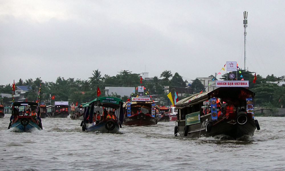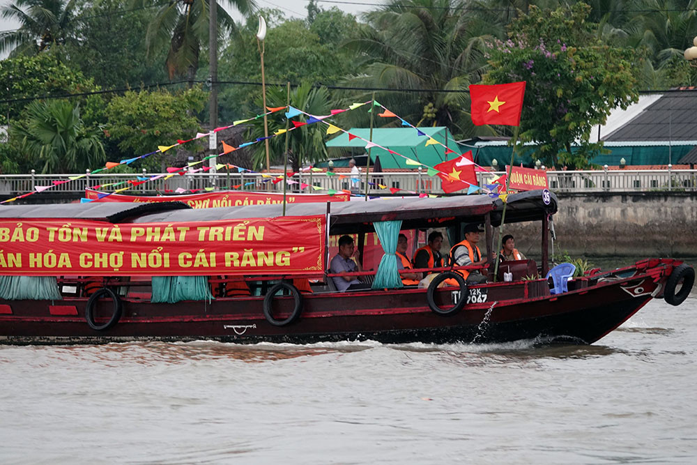 Các tàu diễu hành bắt mắt, cờ đỏ sao vàng tung bay phất phới. Bà con tiểu thương Chợ nổi Cái Răng hào hứng chào đón ngày hội; các ghe treo cờ đỏ sao vàng trên nóc.