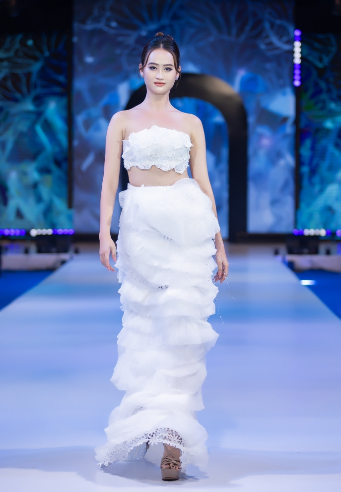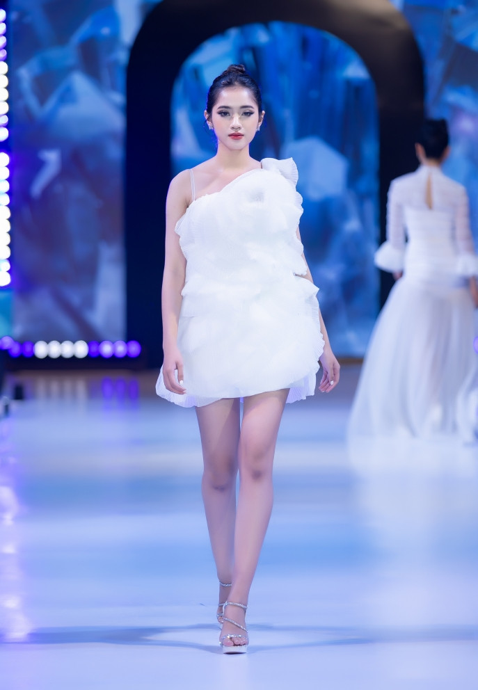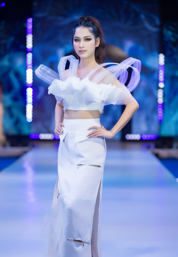Trong khi đó, Hoa hậu Đỗ Thị Hà gây chú ý khi trình diễn BST Cảm hứng Vạn Tượng. Thời gian qua, nàng hậu gây chú ý khi lấn sân sang lĩnh vực kinh doanh làm đẹp. Chân dài quê Thanh Hóa cho biết điều đó không đồng nghĩa với việc cô hoàn toàn từ bỏ showbiz.