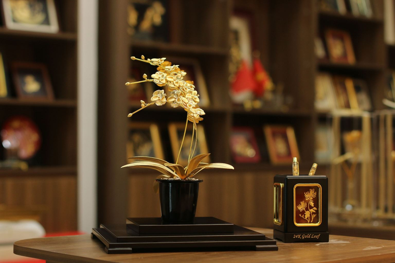 Hay chậu lan bằng đồng mạ vàng 10 nhánh, cao 52cm, có giá bán 31 triệu đồng. Tương tự, một chậu lan dát vàng khác kích thước 48x48cm có giá bán 35 triệu đồng.