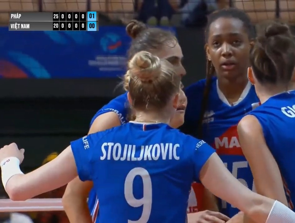 Kiều Trinh đập bóng khiến hai tay chắn của ĐT Pháp để mất điểm. Sau đó là pha bóng giằng co hấp dẫn được kết thúc bằng pha bỏ nhỏ của Thanh Thúy làm bất ngờ các cô gái Pháp.