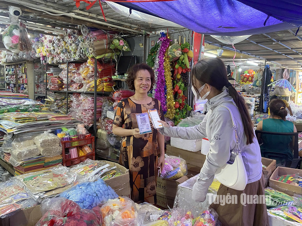 Người dân thanh toán không dùng tiền mặt tại các chợ truyền thống.