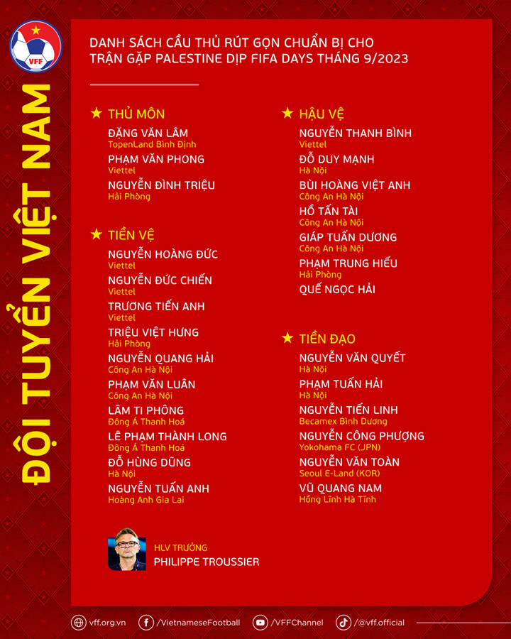 Trước buổi tập chiều 8/9, HLV Philippe Troussier rút gọn danh sách tuyển Việt Nam. Các cầu thủ bị loại gồm: hậu vệ Hoàng Thái Bình, Bùi Tiến Dũng, tiền vệ Nguyễn Hữu Sơn, Dương Văn Hào và tiền đạo Đinh Thanh Bình. Trong khi đó, nhóm 4 cầu thủ điều chuyển từ đội tuyển U23 Việt Nam lên tuyển Việt Nam chỉ có hậu vệ Giáp Tuấn Dương trụ lại trong danh sách rút gọn. Hậu vệ Trần Nam Hải được tăng cường cho đội tuyển Olympic Việt Nam chuẩn bị cho Asiad 19. Về trường hợp của cầu thủ Việt kiều Nguyễn An Khánh, mặc dù rất nỗ lực nhưng tiền vệ mới tròn 18 tuổi này vẫn chưa đáp ứng được các yêu cầu về chuyên môn của BHL.HLV Philippe Troussier có sự đánh giá một cách kỹ lưỡng và công bằng trước khi rút gọn danh sách.Trước khi di chuyển tới Nam Định, HLV Philippe Troussier sẽ chốt danh sách chính thức gồm 23 cầu thủ.Công Phượng gần như không được thi đấu ở Nhật Bản nên rất tích cực tập luyện để lấy lại phong độ, ghi điểm với HLV Philippe Troussier.Tương tự là trường hợp của Văn Toàn. Kể từ đợt tập trung cùng tuyển Việt Nam hồi tháng 6, anh chưa được ra sân phút nào tại giải hạng Nhì Hàn Quốc."Tôi chưa dám nói về về mục tiêu cá nhân của mình ở trận đấu tới. Tôi cũng chưa đặt mục tiêu ghi bàn, chỉ mong rằng mình được vào sân thi đấu trước Palestine. Đã lâu rồi tôi chưa vào sân ở một trận đấu chính thức", Văn Toàn chia sẻ.Tuyển Việt Nam sẽ có thêm một ngày tập luyện tại Hà Nội trước khi di chuyển tới Nam Định vào ngày 10/9 để chuẩn bị cho trận giao hữu gặp Palestine, diễn ra trên SVĐ Thiên Trường vào ngày 11/9.