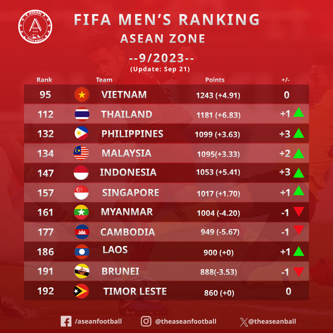 Ở khu vực Đông Nam Á, ba đội tuyển gồm Thái Lan, Indonesia và Malaysia đều có sự thăng tiến so với tháng trước. Cụ thể, Thái Lan tăng từ 114 vươn lên 112 thế giới sau các trận đấu tại King's Cup. Indonesia tăng 3 bậc (lên vị trí thứ 147) sau trận thắng Kyrgyzstan. Malaysia cũng tăng lên vị trí thứ 134.