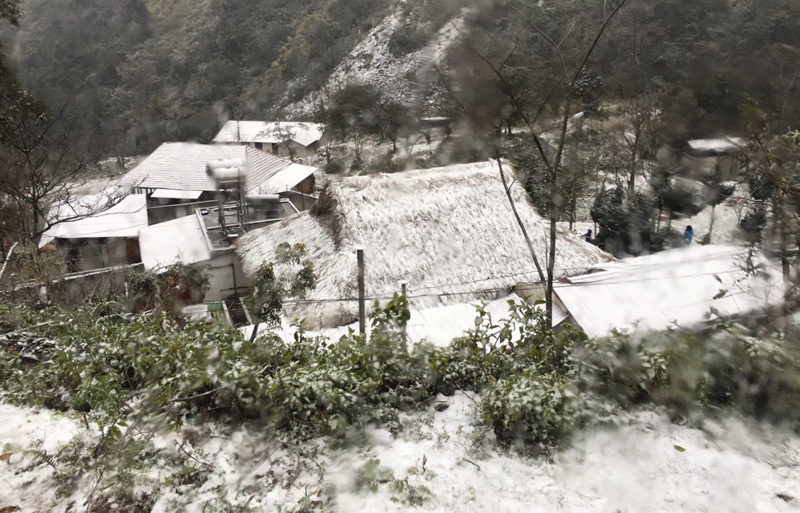 Nhiệt độ ở đỉnh Fansipan xuống âm 1 độ C làm nước đóng băng. Ở khu vực đặt chóp tháp, lớp băng mỏng trải đều trên sàn gỗ.
