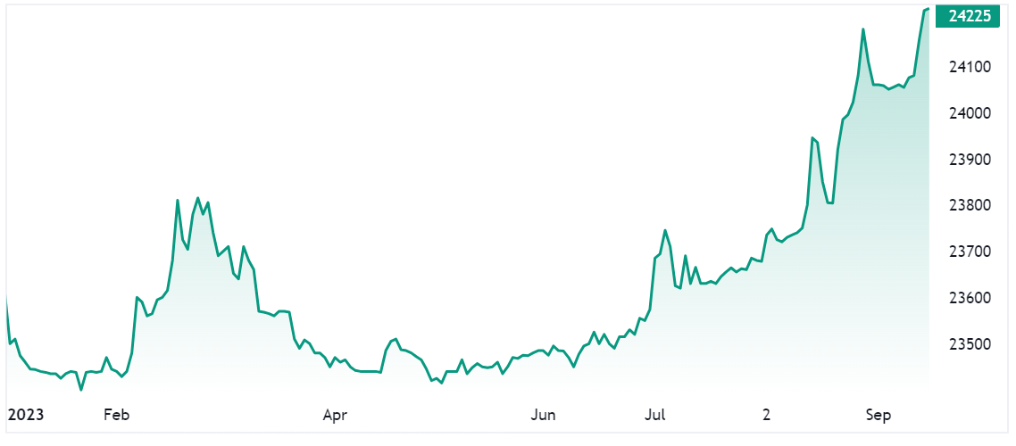 Tỷ giá trung tâm được Ngân hàng Nhà nước công bố mới nhất ở mức 24.036 đồng/USD và là mức đỉnh lịch sử của cặp tỷ giá này. Giá USD ở các ngân hàng thương mại dao động khoảng 24.000-24.440 đồng theo chiều mua và bán, giá USD trên thị trường tự do khoảng 24.180-24.260 đồng.