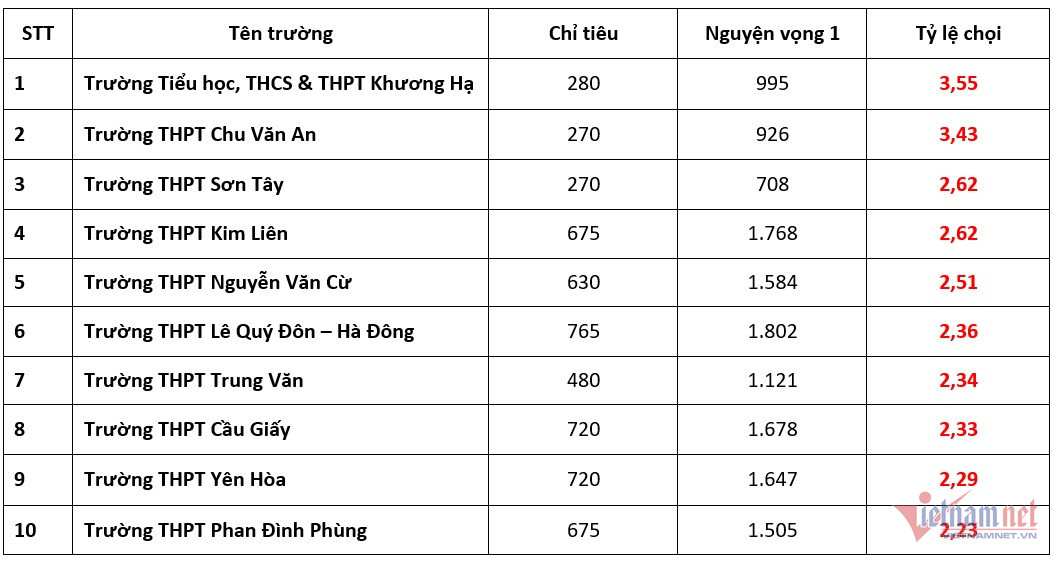 Tiếp đến là THPT Chu Văn An tỷ lệ cạnh tranh suất vào trường là 1/3,43. Cùng chung tỷ lệ chọi 1/2,62 ở vị trí thứ 3 và 4 là THPT Kim Liên và THPT Sơn Tây. Các trường thuộc top 10 ở những năm học trước vẫn khá ổn định: THPT Trương Định tỷ lệ chọi 2,05; THPT Phan Đình Phùng tỷ lệ chọi 2,23; THPT Việt Đức tỷ lệ chọi 1,78; THPT Nguyễn Thị Minh Khai tỷ lệ chọi 1,68...