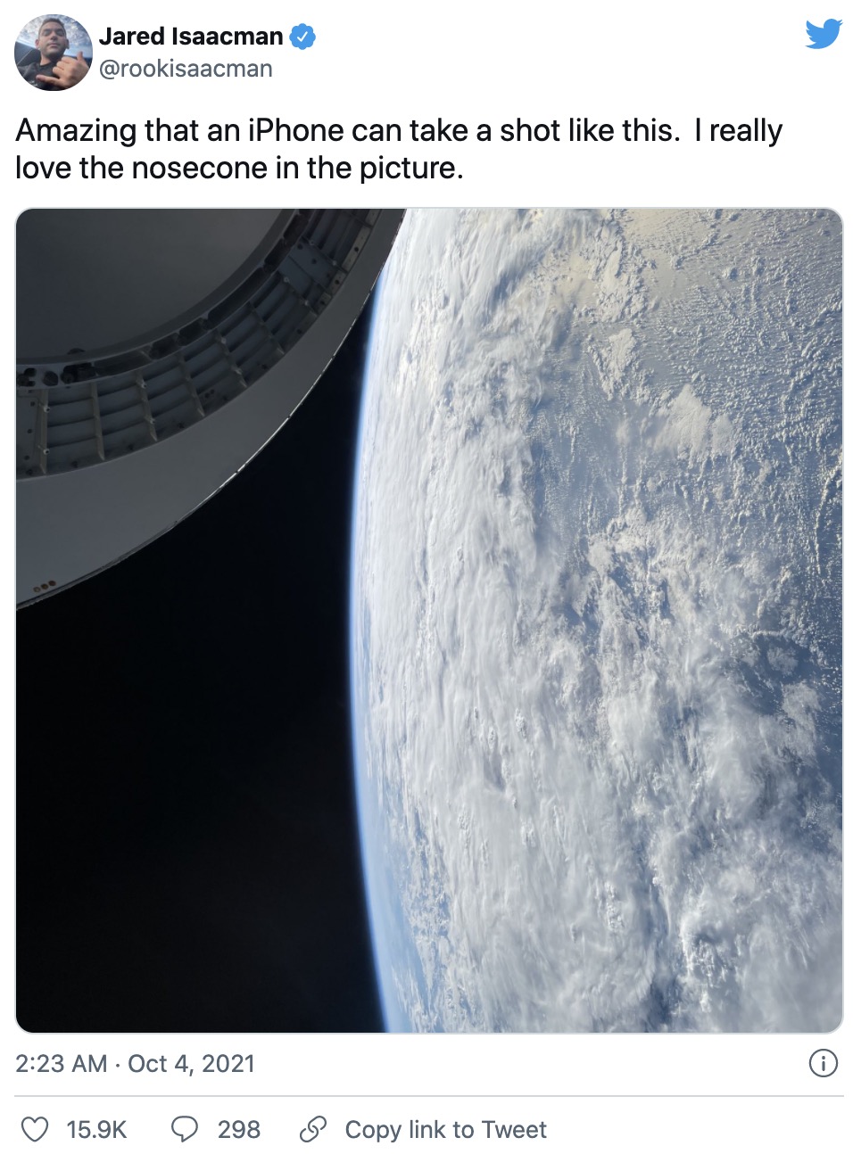 Phi hành đoàn Inspiration4 của SpaceX đã bắt đầu chia sẻ một số hình ảnh và video được chụp từ không gian trong chuyến du hành dân sự vào quỹ đạo đầu tiên trên thế giới vào tháng trước. Một vài hình ảnh đầu tiên do SpaceX chia sẻ được chụp bằng máy ảnh DSLR Nikon, nhưng những hình ảnh được chia sẻ trong gần đây nhất của chỉ huy, tỷ phú Jared Isaacman lại được chụp bằng iPhone 12.