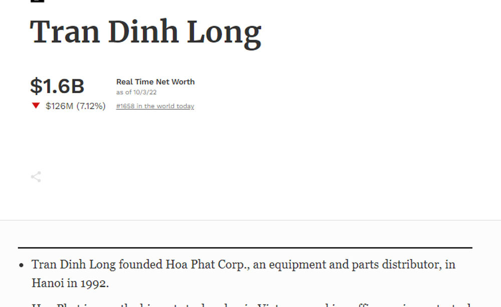 Tính từ đầu năm, cổ phiếu HPG vẫn mất khoảng 47%. Tài sản của ông Trần Đình Long mất tương ứng khoảng 1,5 tỷ USD.