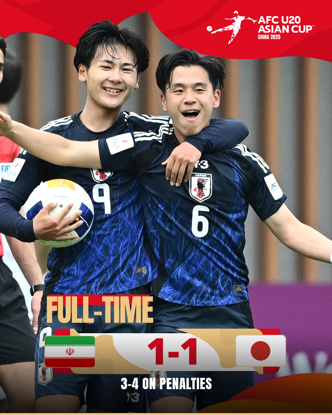 Ở loạt luân 11m lưu cân não, U20 Nhật Bản xuất sắc đánh bại U20 Iran với tỷ số 4-3 để giành vé vào bán kết U20 châu Á, và quan trọng hơn là suất tham dự VCK U20 World Cup 2025.
