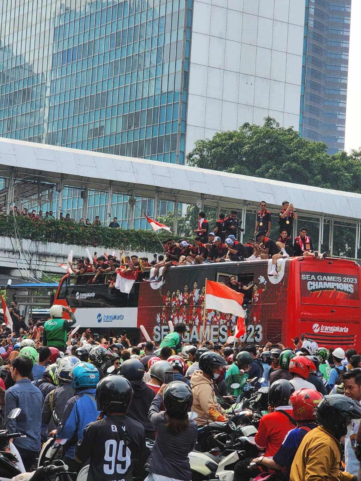 Chiếc xe buýt 2 tầng chở các thành viên của U22 Indonesia xuất phát từ Tòa nhà Kemenpora qua nhiều con phố ở thủ đô Jakarta và điểm kết thúc là SVĐ Gelora Bung Karno.