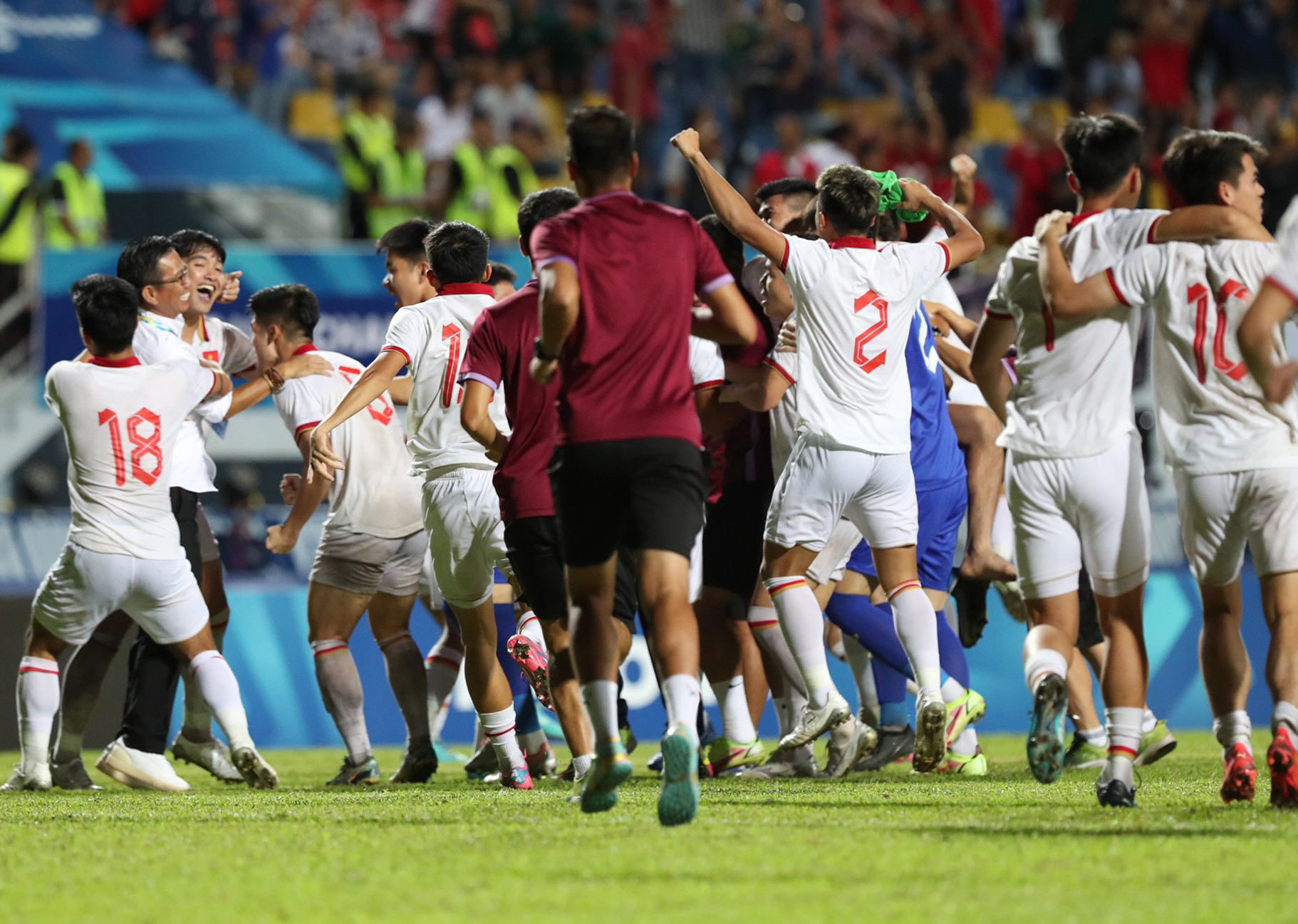 Sau 120 phút không có bàn thắng trong trận chung kết giải U23 Đông Nam Á 2023, U23 Việt Nam và U23 Indonesia phải phân định thắng thua bằng loạt sút luân lưu cân nãoU23 Việt Nam là những người bản lĩnh hơn khi giành chiến thắng 6-5, qua đó bảo vệ thành công ngôi vô địch giải U23 Đông Nam Á.Các cầu thủ U23 Việt Nam có màn ăn mừng đầy cảm xúc. Tất cả chạy về phía HLV Hoàng Anh Tuấn.Các cầu thủ Việt Nam công kênh ông thầy người Khánh Hòa.U23 Việt Nam không chỉ bảo vệ thành công cúp vô địch mà đây còn là danh hiệu đầu tiên của HLV Hoàng Anh Tuấn. Dù có nhiều năm gắn bó với bóng đá trẻ và các đội tuyển trẻ Việt Nam, HLV Hoàng Anh Tuấn vẫn chưa có danh hiệu vô địch nào.Lần gần nhất HLV Hoàng Anh Tuấn bước vào một trận chung kết trong vai trò HLV trưởng diễn ra cách đây 8 năm. Khi đó, U19 Việt Nam thua U19 Thái Lan ở trận tranh ngôi vô địch. Lần này, Khuất Văn Khang cùng các đồng đội mang về chiến thắng cùng danh hiệu rất ý nghĩa với chiến lược gia người Khánh Hòa.HLV Hoàng Anh Tuấn tỏ ra rất "mát tay" với bóng đá trẻ. Năm 2016, ông góp công giúp U19 Việt Nam lần đầu tiên giành vé dự U20 World Cup. Thuyền trưởng U23 Việt Nam không quên cảm ơn các CĐV.Quan Văn Chuẩn trở thành người hùng của U23 Việt Nam khi cản phá thành công cú sút luân lưu của U23 IndonesiaU23 Việt Nam giành chức vô địch và trở thành đội bóng giàu thành tích nhất sân chơi này với 2 lần vô địch. Ngoài ra, U23 Việt Nam cũng ghi dấu ấn khi trở thành đội bóng đầu tiên bảo vệ thành công ngôi vô địch. Dù chỉ đặt mục tiêu vào chung kết nhưng HLV Hoàng Anh Tuấn cùng các học trò đã làm tốt nhất, bảo vệ thành công ngôi vô địch Đông Nam Á.U23 Việt Nam xứng đáng vô địch giải U23 Đông Nam Á 2023. Thầy trò HLV Hoàng Anh Tuấn nhận thưởng nóng 1,8 tỷ đồng từ VFF.