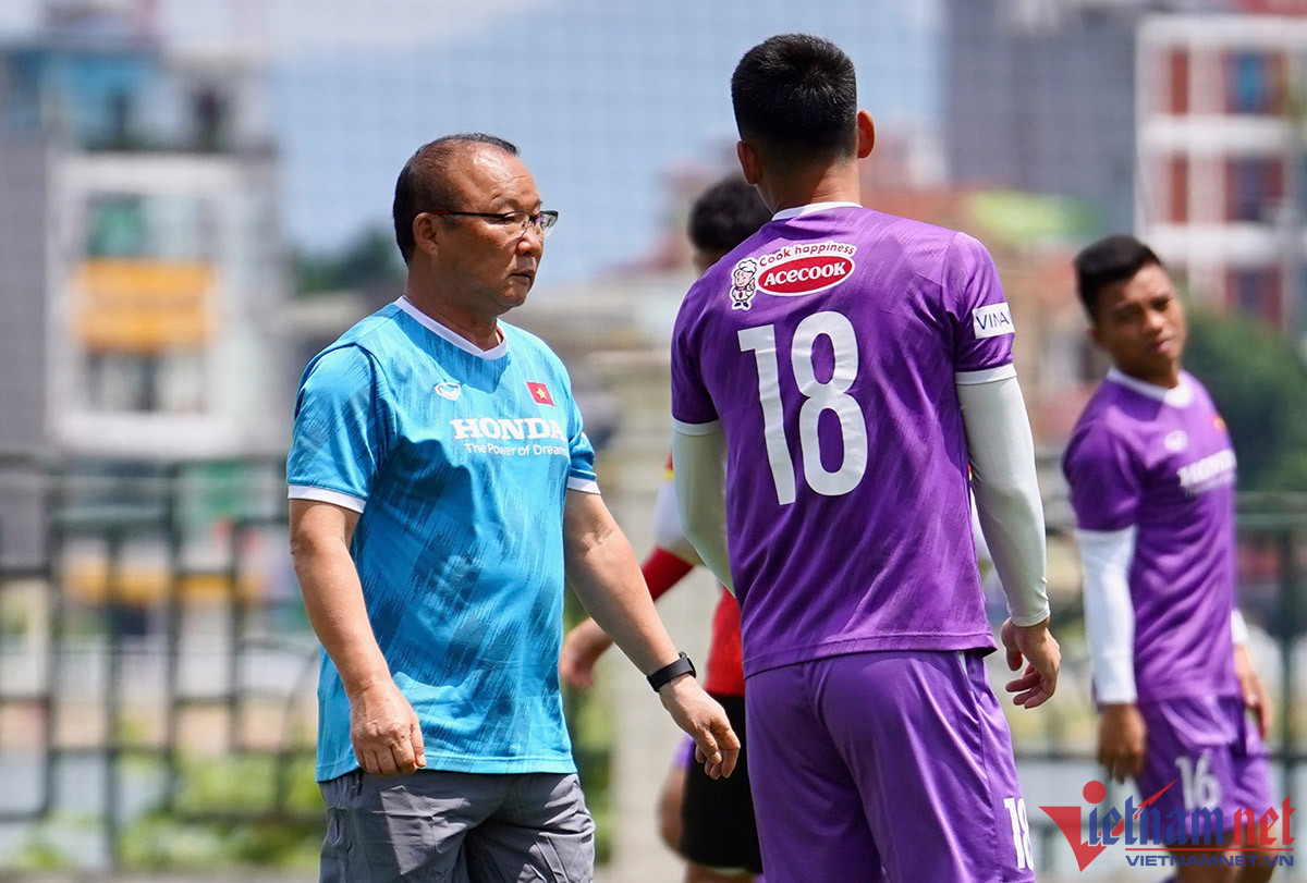 Vẫn như thường lệ, HLV Park Hang Seo trao đổi khá lâu với các học trò trước buổi tập. Ông thầy người Hàn Quốc đặc biệt nhấn mạnh tới sự tập trung của các cầu thủ, khi đây là giai đoạn tập luyện nước rút rất quan trọng.