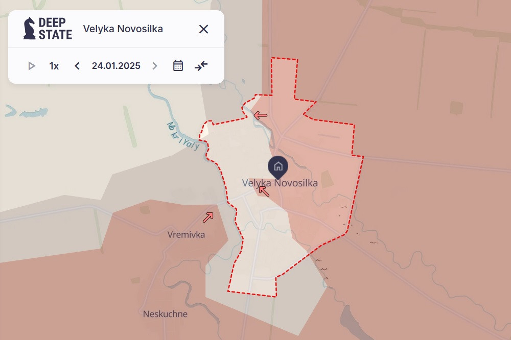 Theo bản đồ chiến sự do trang DeepState của Ukraine cập nhật sáng 24/1, quân Nga đã kiểm soát hơn một nửa ngôi làng Velyka Novosilka.