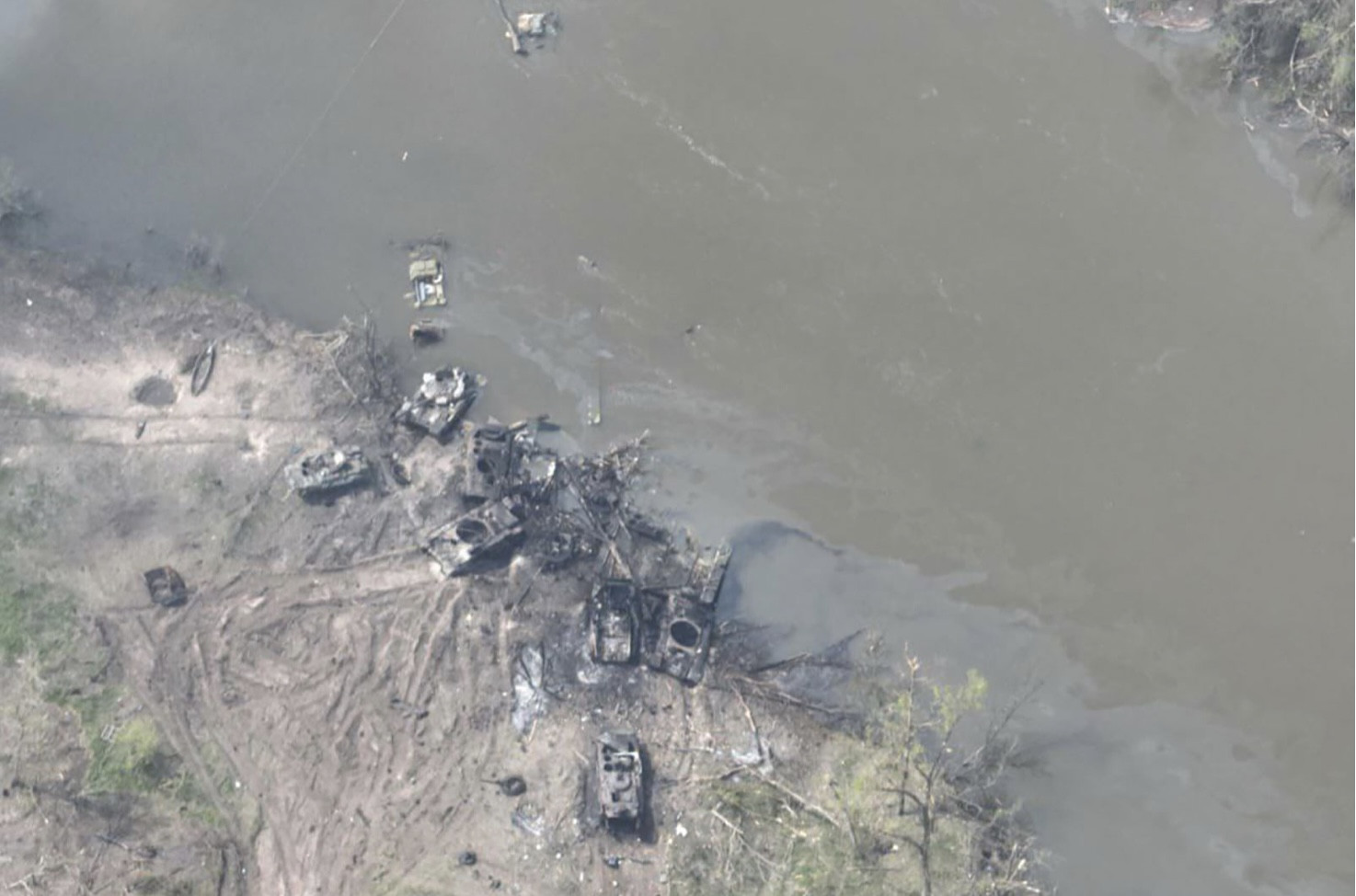 Ảnh bổ sung lan truyền trên mạng xã hội cũng do máy bay không người lái chụp. Nó cho thấy, quân Nga đang cố thiết lập cầu phao thứ hai để băng qua sông. Tuy nhiên, cây cầu này cũng bị các lực lượng Ukraine làm nổ tung.