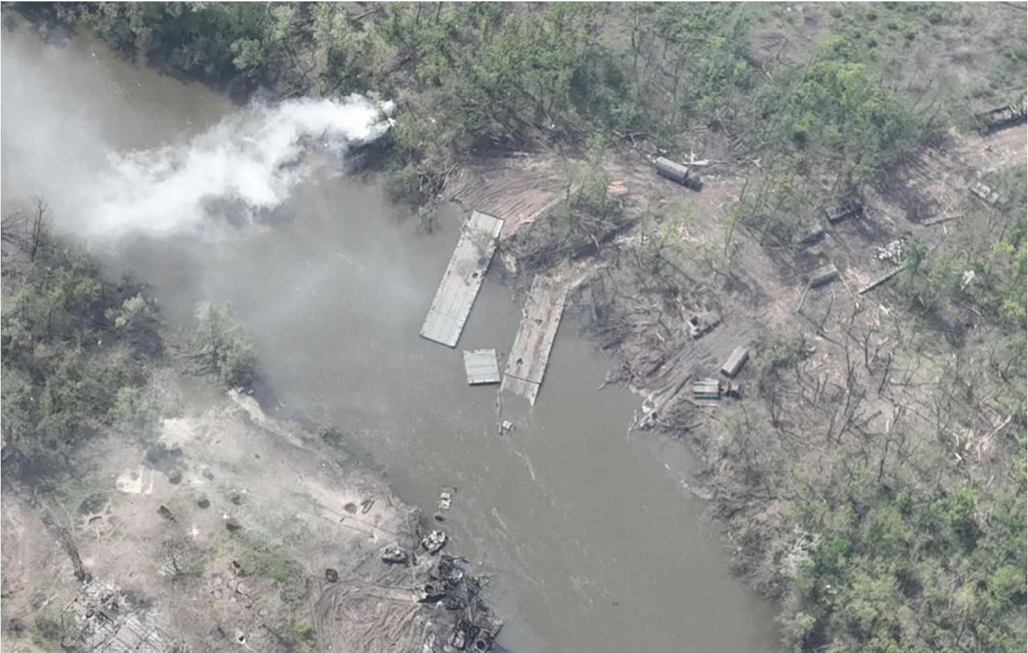 Khói bốc lên từ bờ tây của sông Siverskyi Donets và phía cuối của cây cầu. Ở bờ phía đông, các miệng hố và khói cũng xuất hiện, gồm cả ở những chỗ quanh xe quân sự Nga đã băng qua.