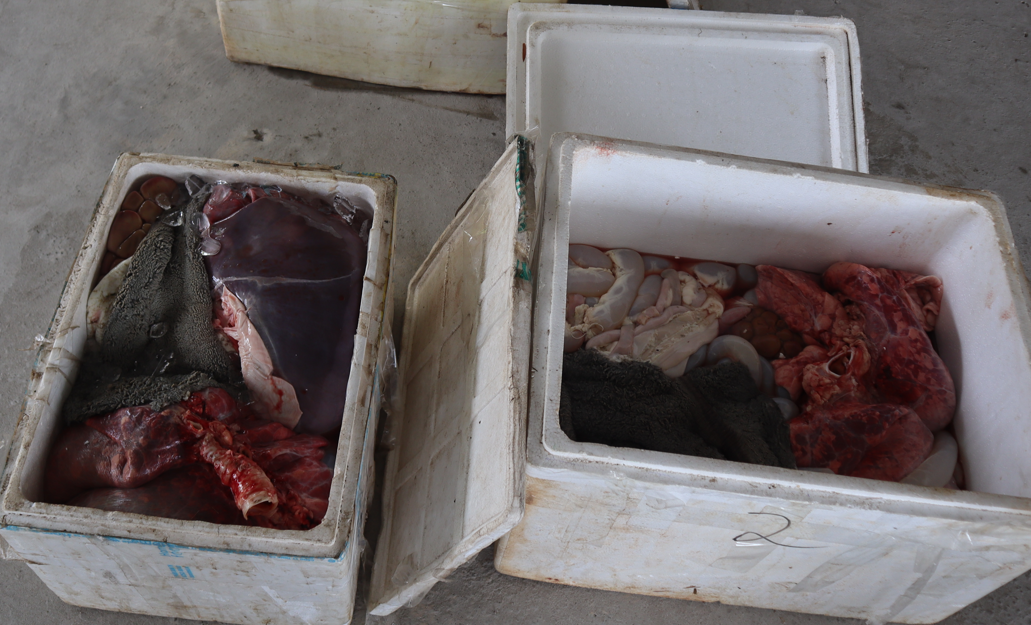 Kiểm tra phát hiện trên xe đang vận chuyển các thùng xốp chứa nội tạng động vật có tổng trọng lượng 130 kg đã bốc mùi hôi thối và biến dạng về màu sắc.
