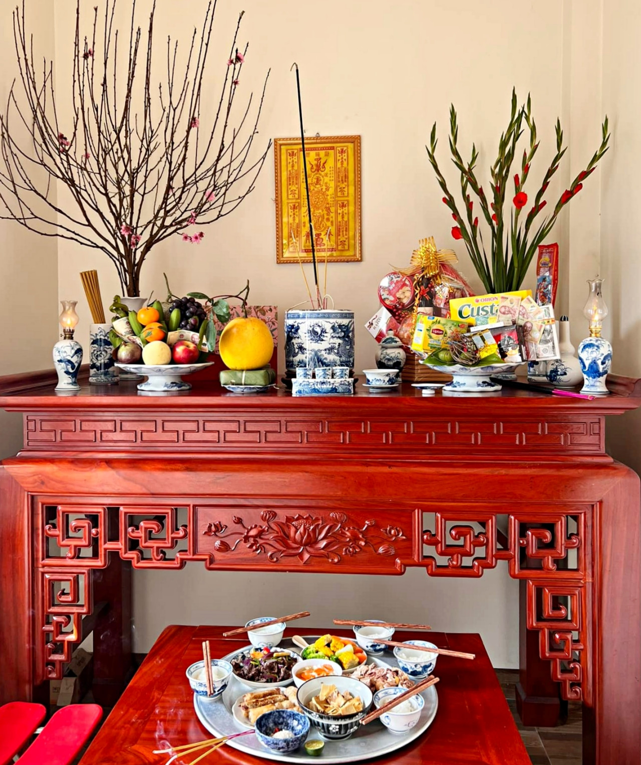 Chúng con cùng toàn thể con cháu trong nhà sửa sang lễ vật, oản quả hương hoa kính dâng trước án.