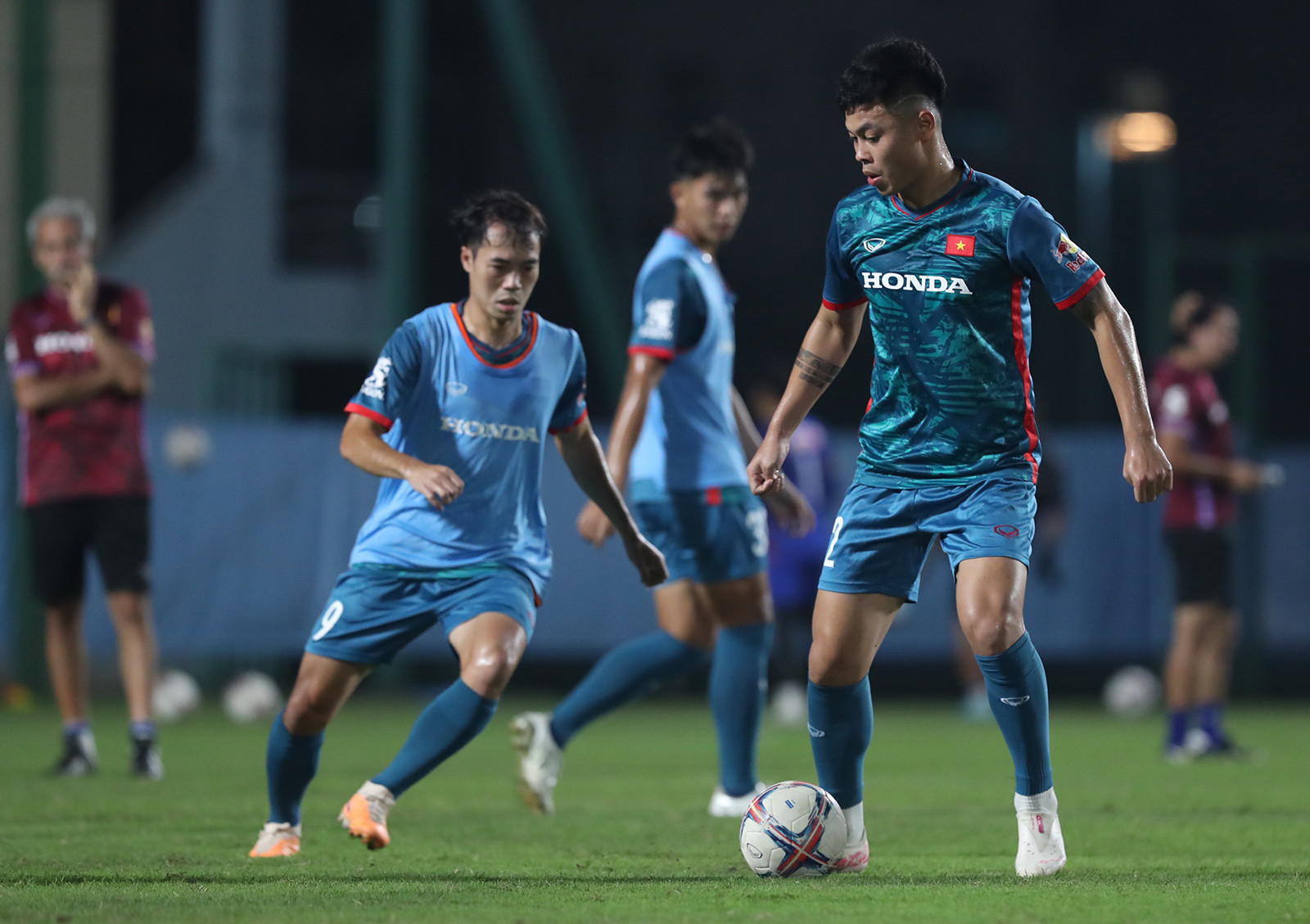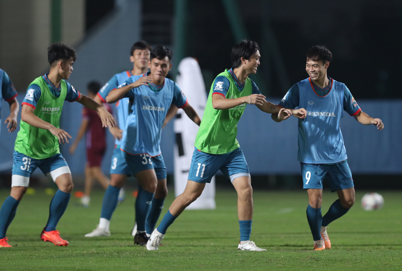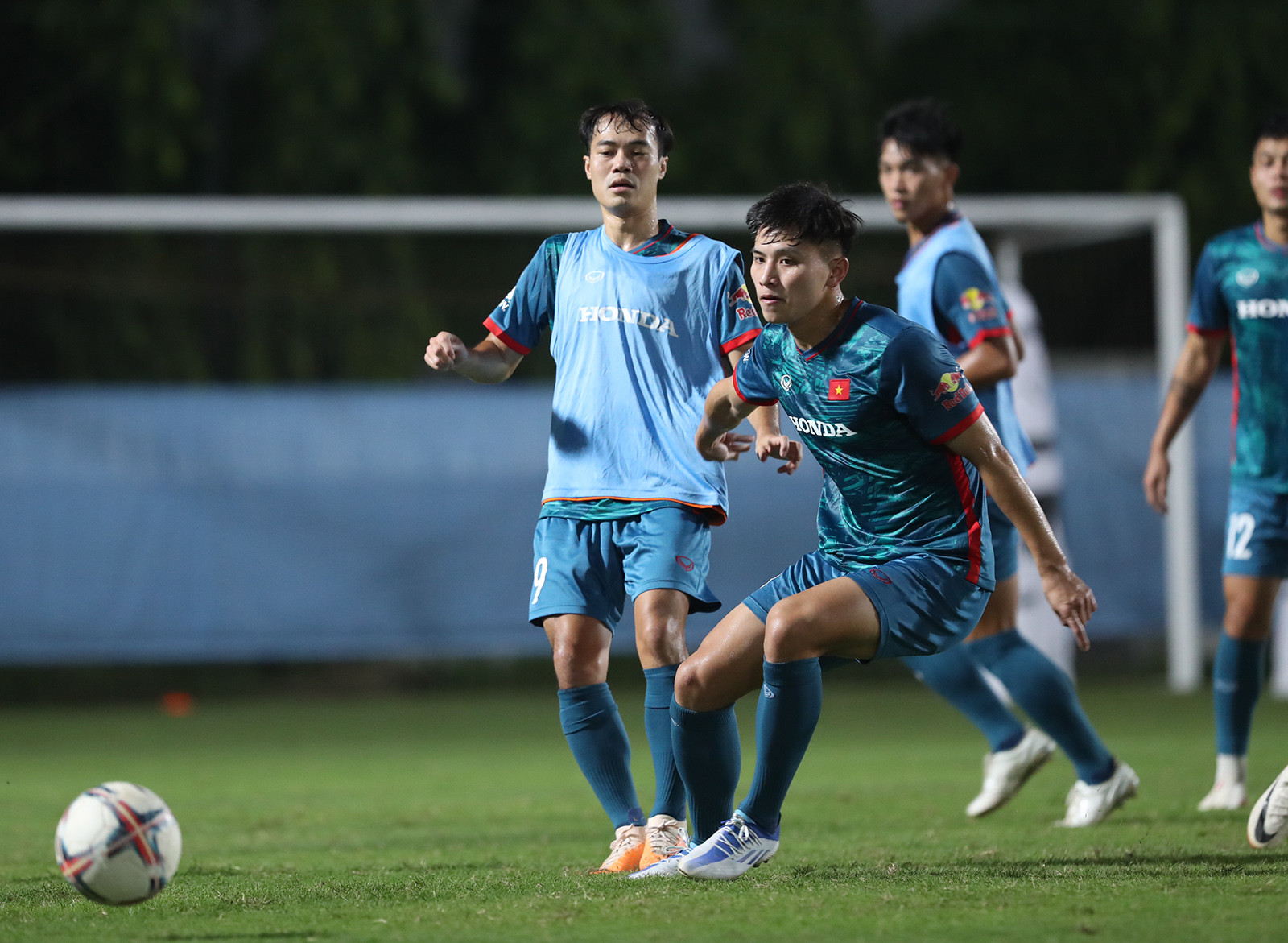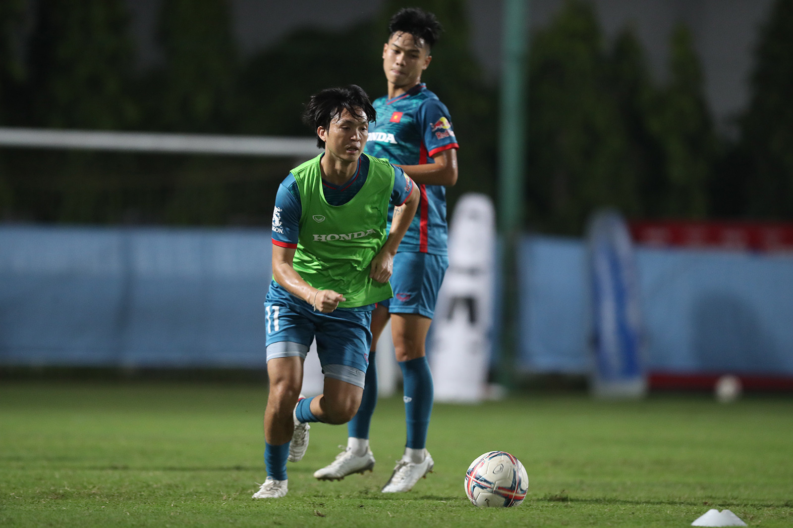Văn Toàn và người đồng đội cũ ở HAGL Nguyễn Tuấn Anh dính với nhau như hình với bóng trong buổi tập đầu của tuyển Việt Nam tối 3/10.