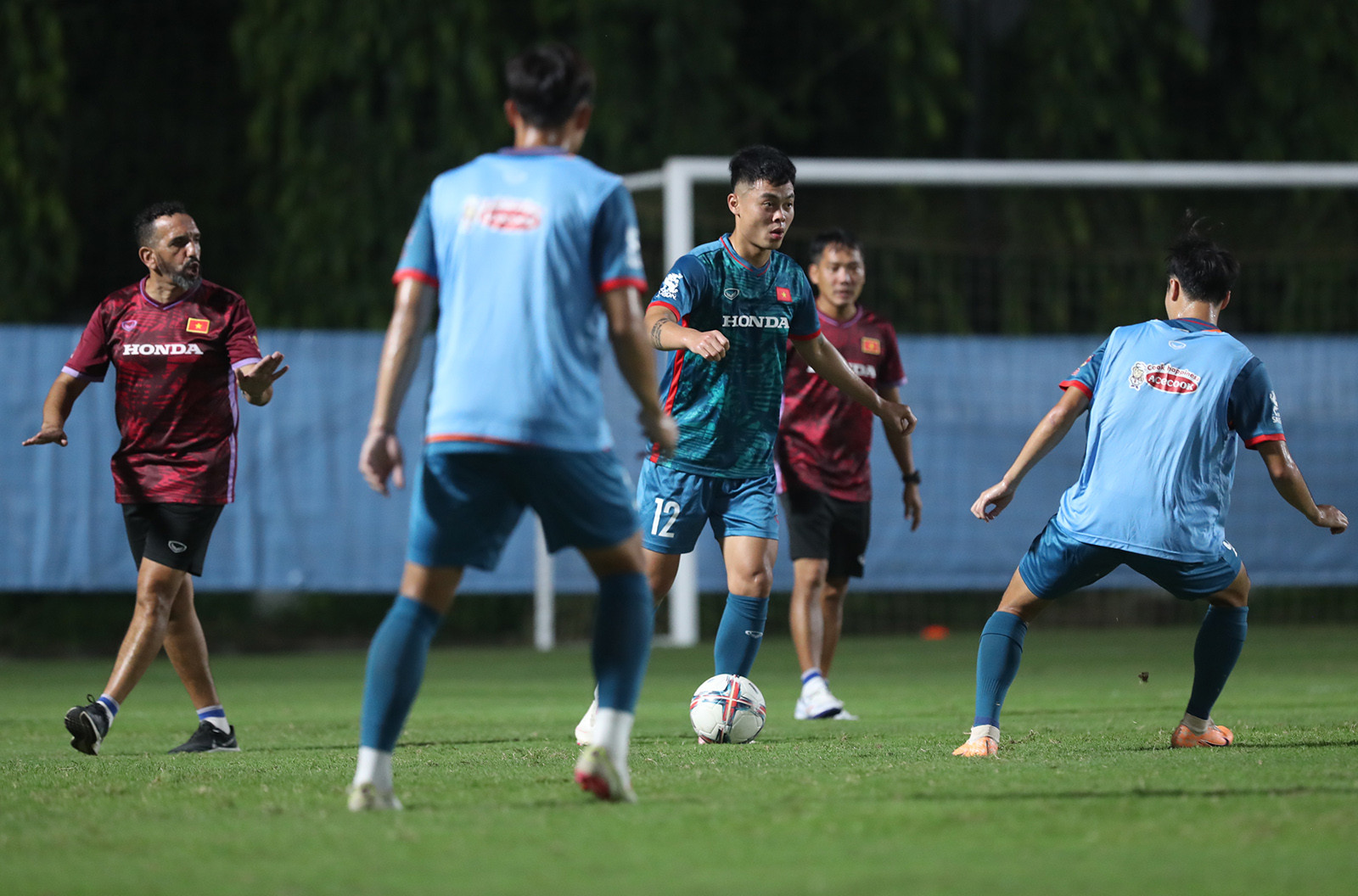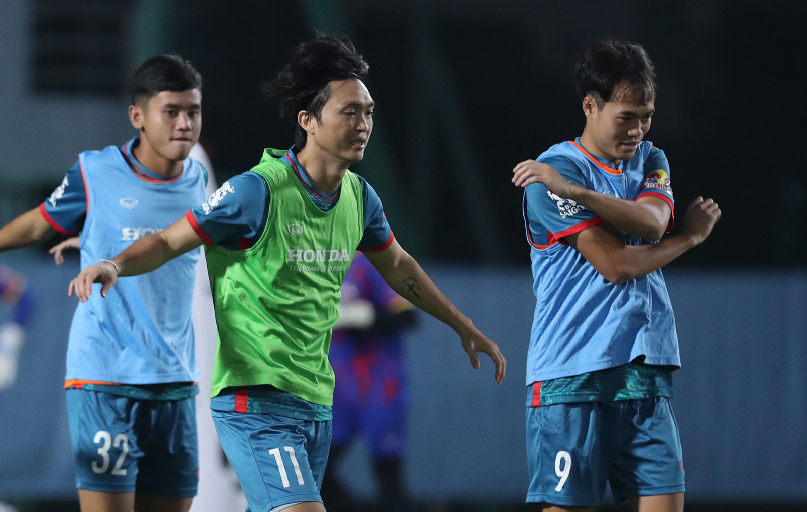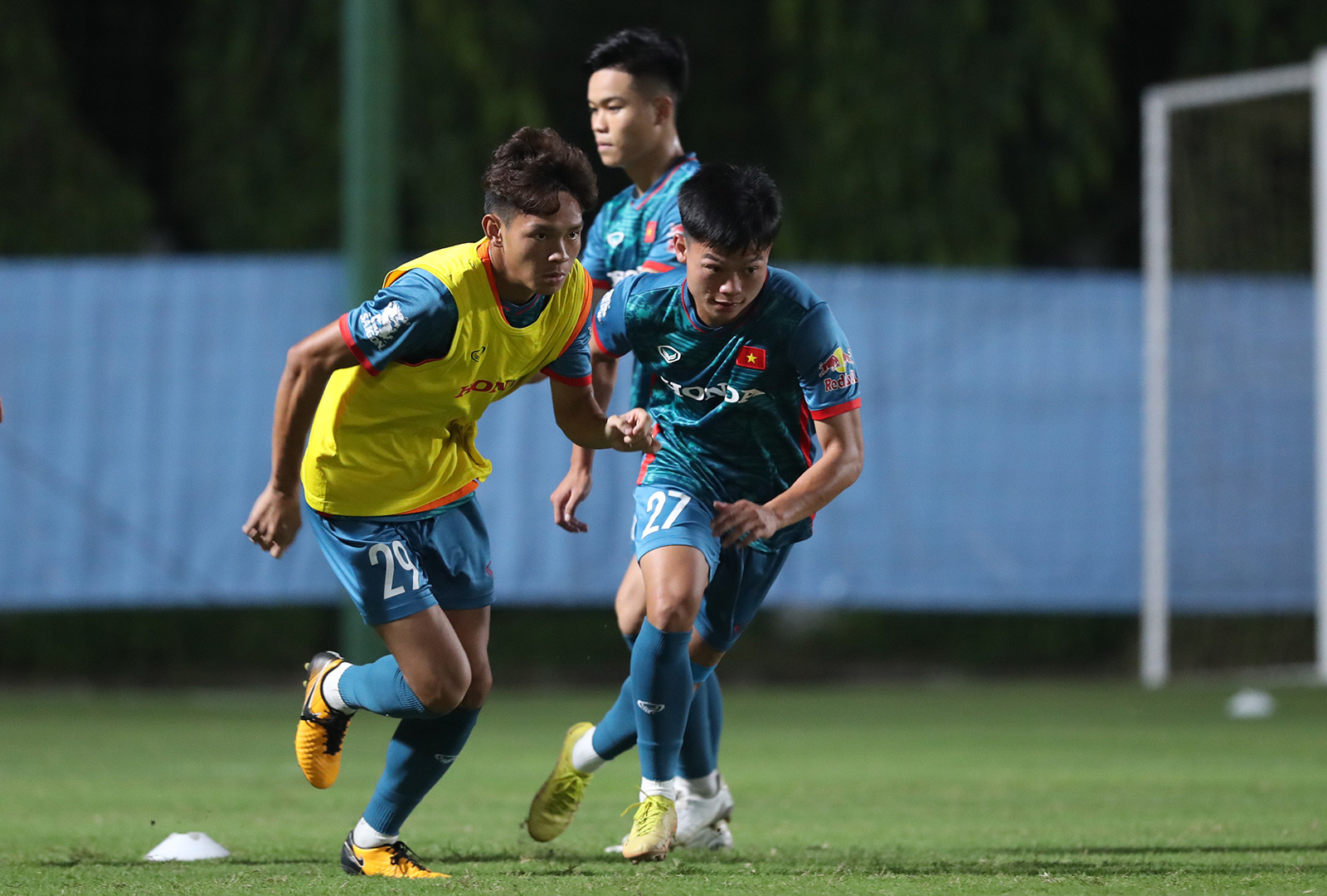 Văn Toàn và người đồng đội cũ ở HAGL Nguyễn Tuấn Anh dính với nhau như hình với bóng trong buổi tập đầu của tuyển Việt Nam tối 3/10.