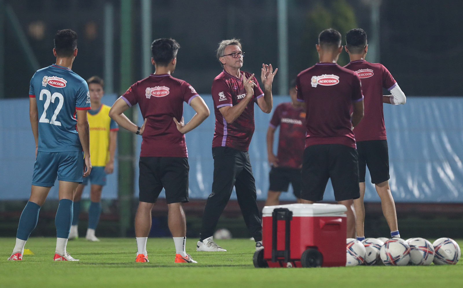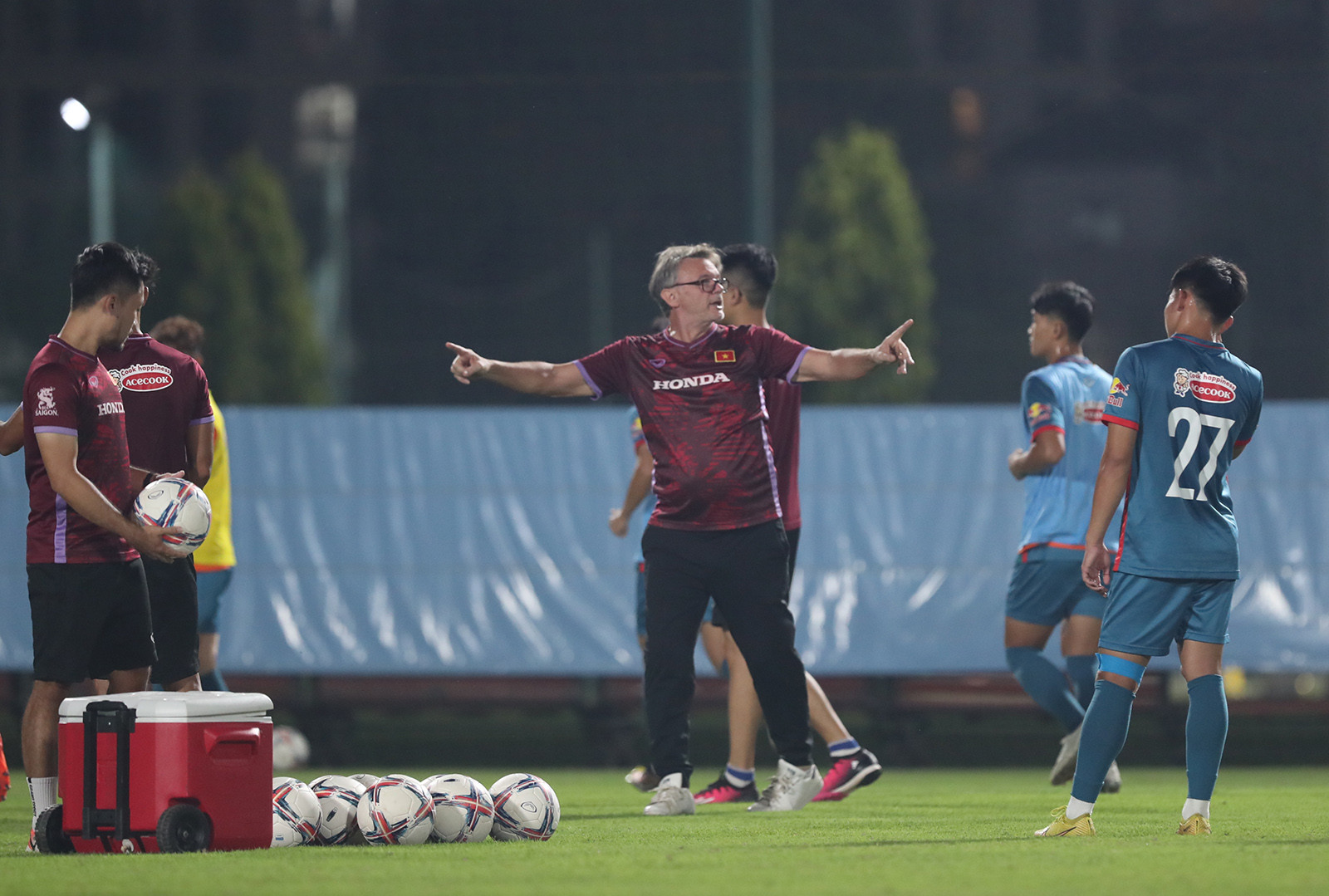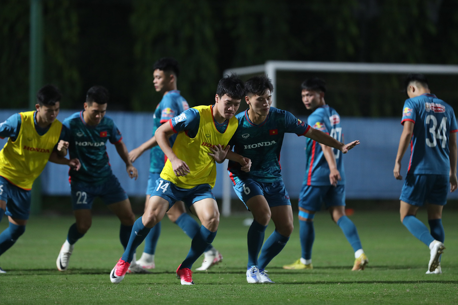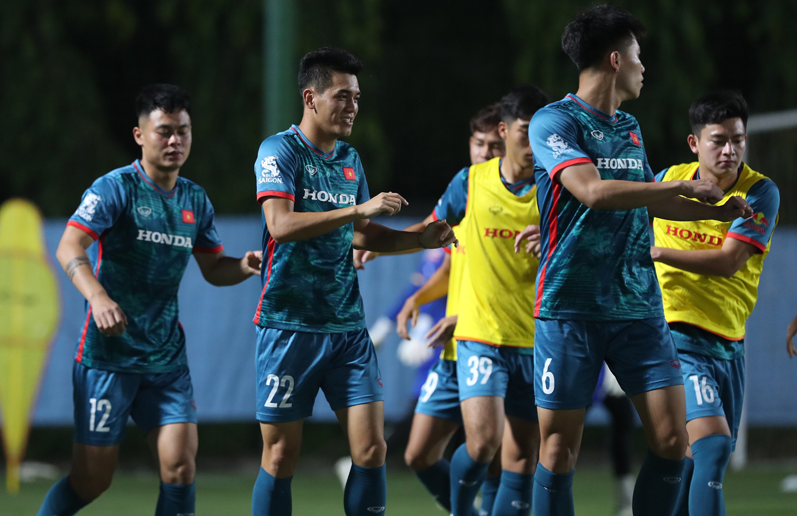 Văn Toàn và người đồng đội cũ ở HAGL Nguyễn Tuấn Anh dính với nhau như hình với bóng trong buổi tập đầu của tuyển Việt Nam tối 3/10.
