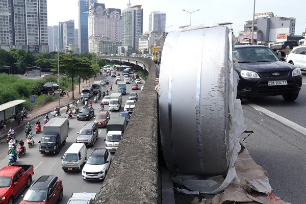 Ô tô tải đang lưu thông trên đường Vành đai 3 cao (Mỹ Đình 2, Nam Từ Liêm, Hà Nội) thì bất ngờ gãy trục bánh, lật chắn ngang đường.