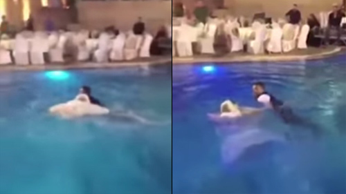 Mặc nguyên váy cùng chú rể nhảy xuống bể bơi, cô dâu luống cuống trong chiếc váy bùng nhùng và suýt nguy hiểm đến tính mạng.