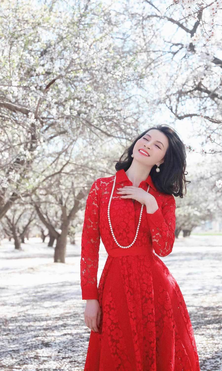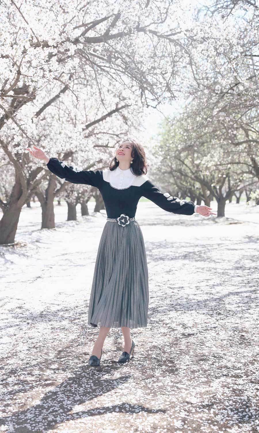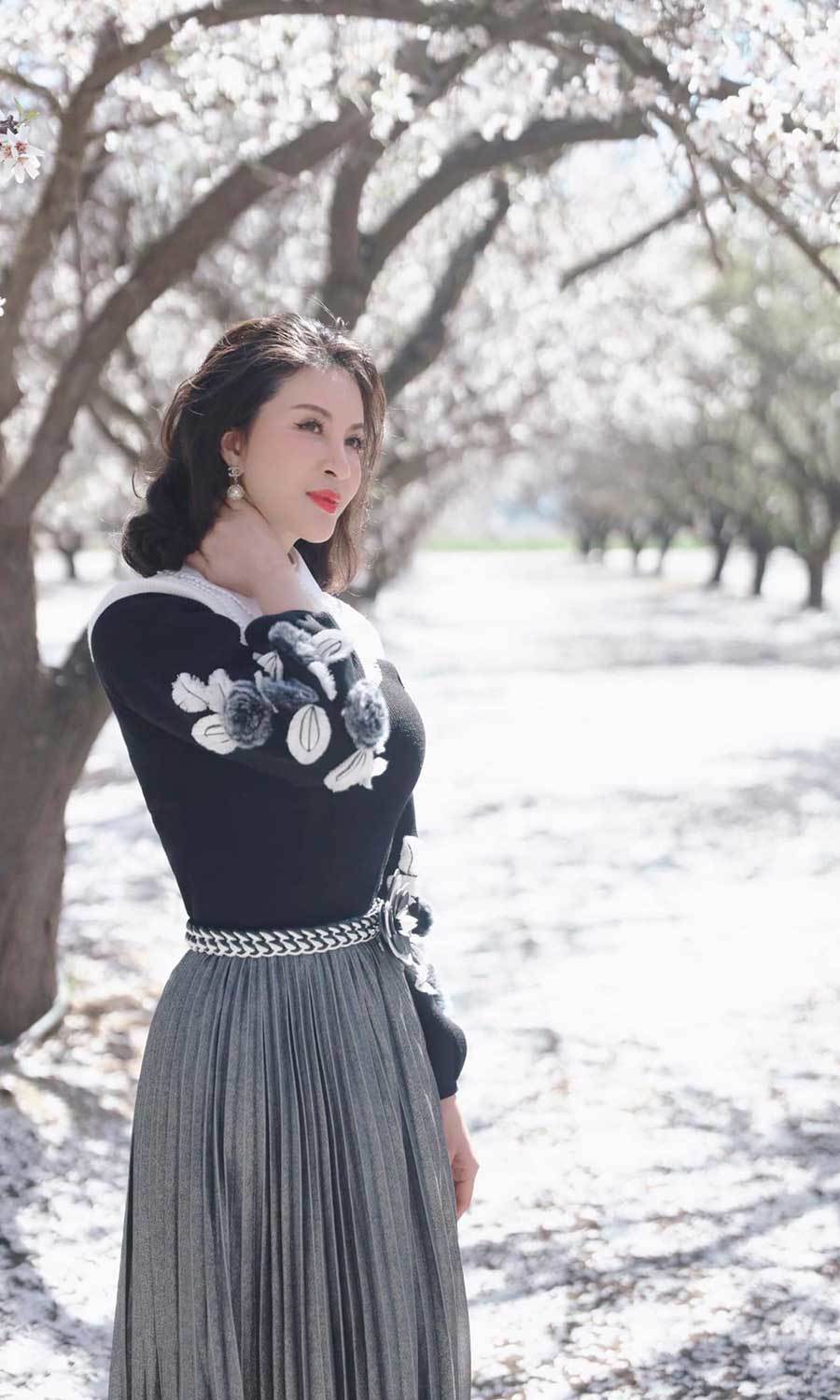 Tầm này, hoa hạnh nhân nở rộ phủ kín một góc trời. Thanh Mai đi dạo qua những hàng cây, ngồi nghỉ dưới một gốc hạnh nhân già để tận hưởng không khí cuối xuân mát mẻ.