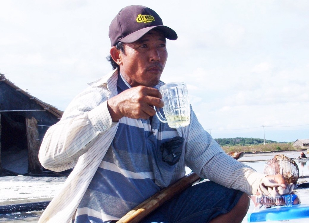 Cách “chống nóng” truyền thống bao đời nay của diêm dân cũng chỉ thêm manh áo dài, thêm khăn bịt mặt, chiếc khăn mặt ẩm đội lên đầu dưới vành nón.
