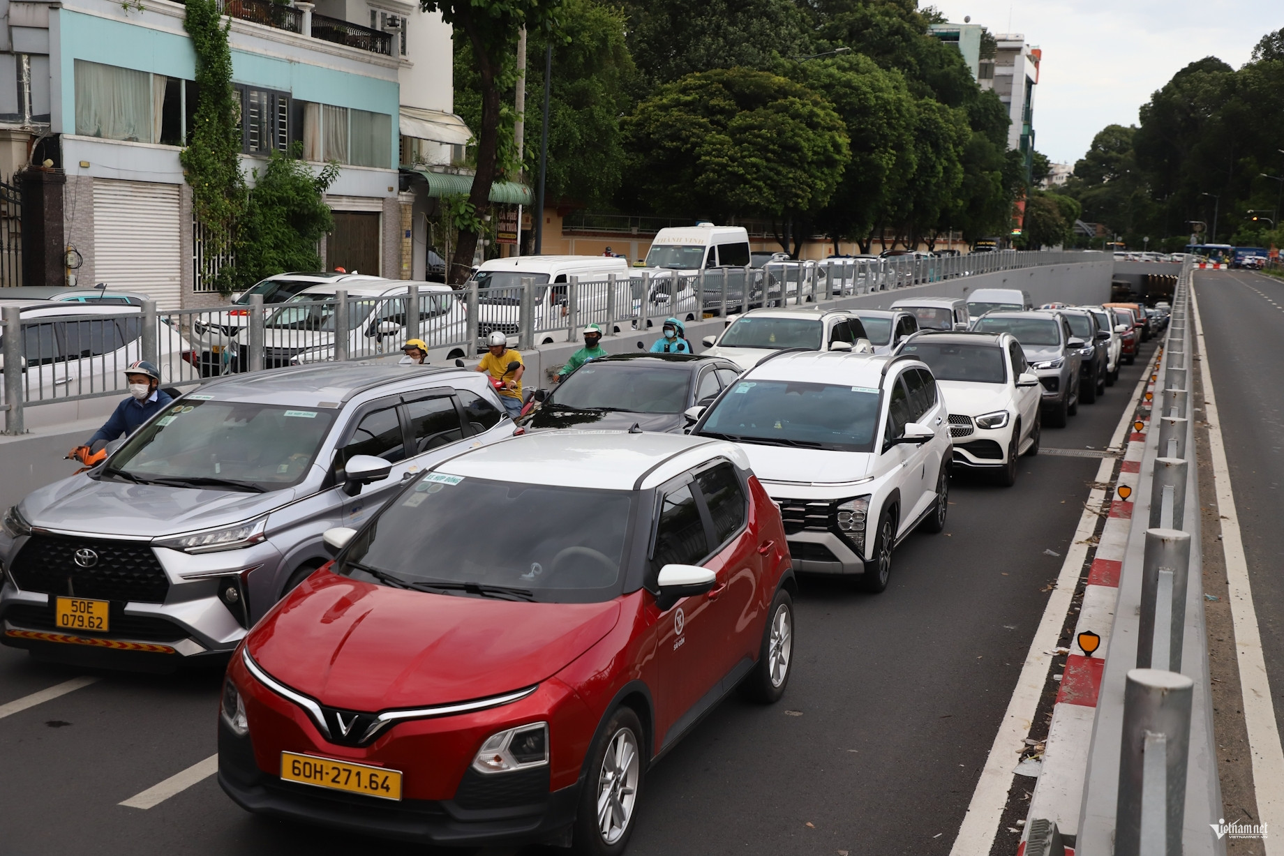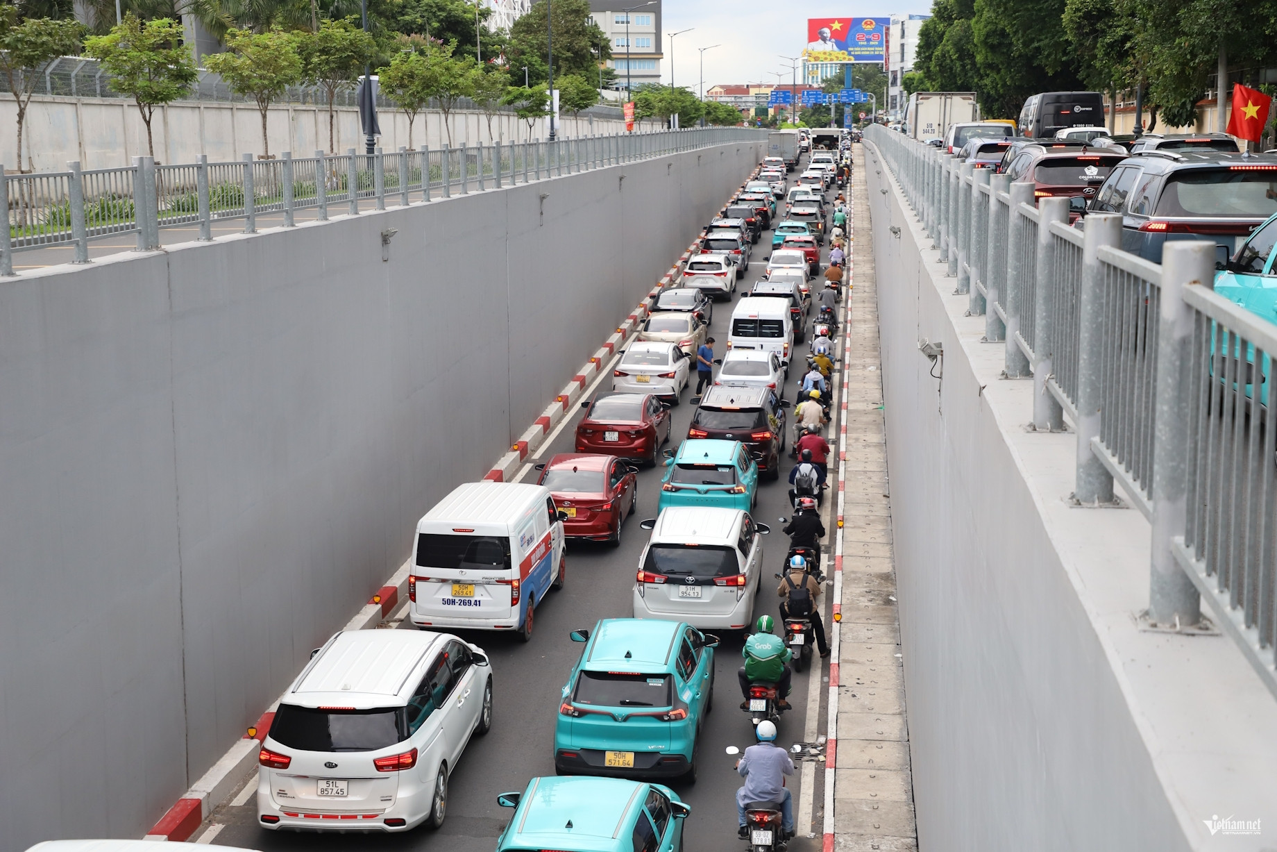 Hầm chui Phan Thúc Duyện - Trần Quốc Hoàn, ô tô và xe máy xếp kín mặt đường, nhích từng mét theo hướng về nhà ga T3 sân bay Tân Sơn Nhất.
