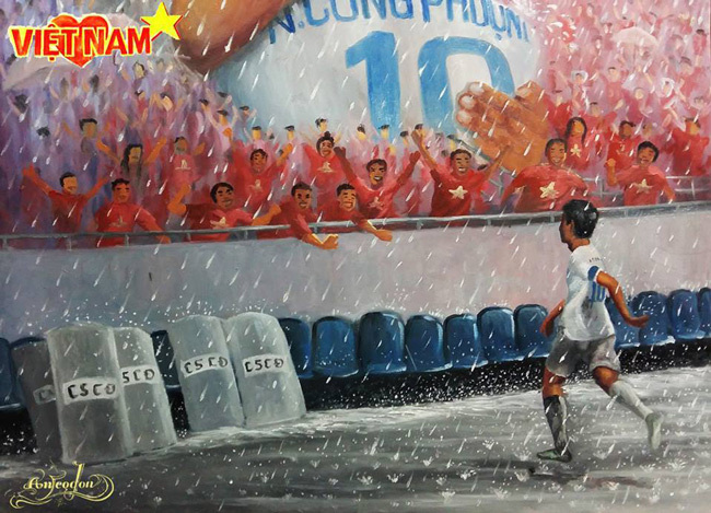 Hình ảnh xúc động khi ăn mừng bàn thắng trong mưa và chạy thẳng về phía khán đài chia vui với người cha của mình đã là nguồn cảm xúc để họa sỹ trẻ An Thắng vẽ lên những bức tranh không thể đẹp hơn.