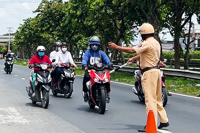Sáng 19/7, Đội CSGT Bình Triệu Công an TP.HCM ra quân, lập chốt xử phạt nhiều người điều khiển xe máy vi phạm tốc độ trên quốc lộ 1 thuộc phường An Phú Đông, quận 12, TP.HCM.