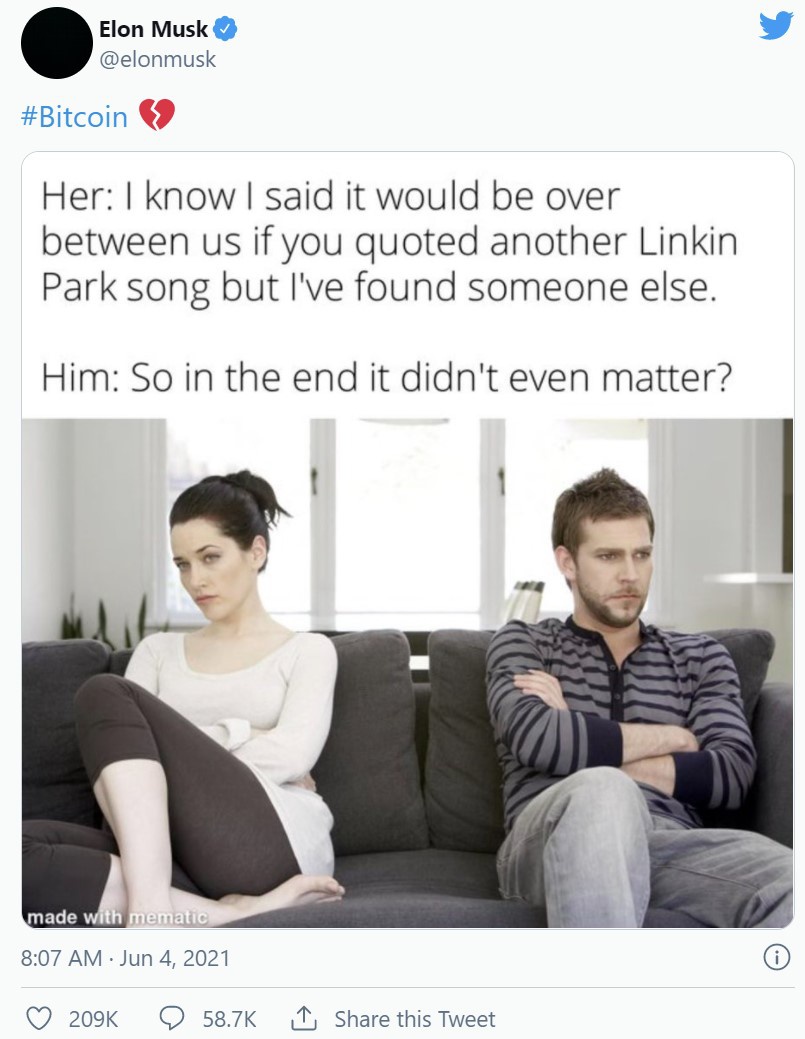 Lần gần nhất Elon Musk đăng bài viết về Bitcoin là hình ảnh đôi tình nhân đang giận dỗi, cùng dòng chữ "BTC" và biểu tượng trái tim tan vỡ. Nhiều người cho rằng đây là tín hiệu cho thấy Elon Musk đã không còn tin vào đồng tiền mã hóa có giá trị lớn nhất. Ngay sau đó, ông lại đăng bức ảnh meme một người giao dịch khó vì đợt điều chỉnh giá.